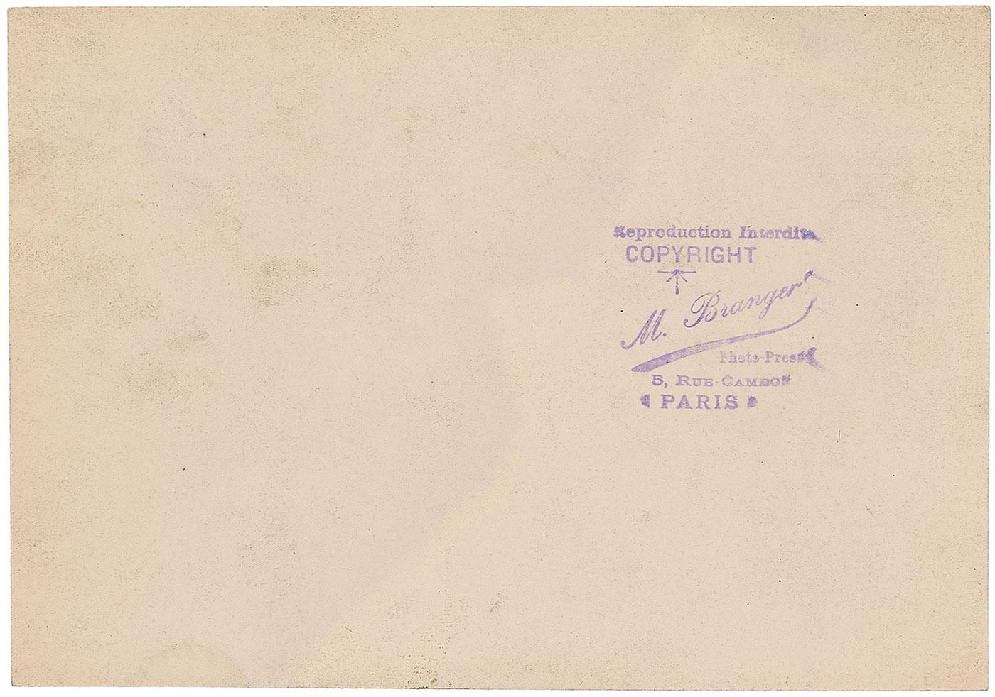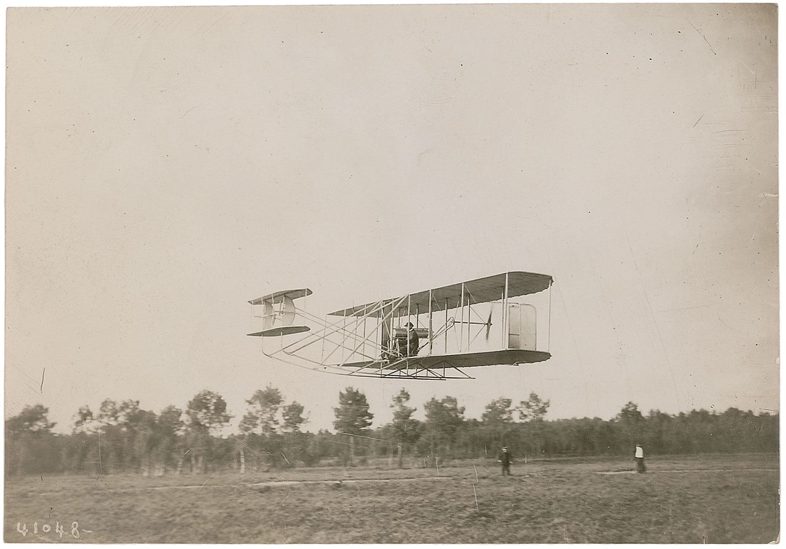 Original 6.25 x 4.5 photo of Wright piloting his flyer through the air near Le Mans, France, in August of 1908. Reverse bears an M. Branger, Paris, photographer's stamp. In fine condition, with a slightly trimmed right edge and some mild soiling along upper right.