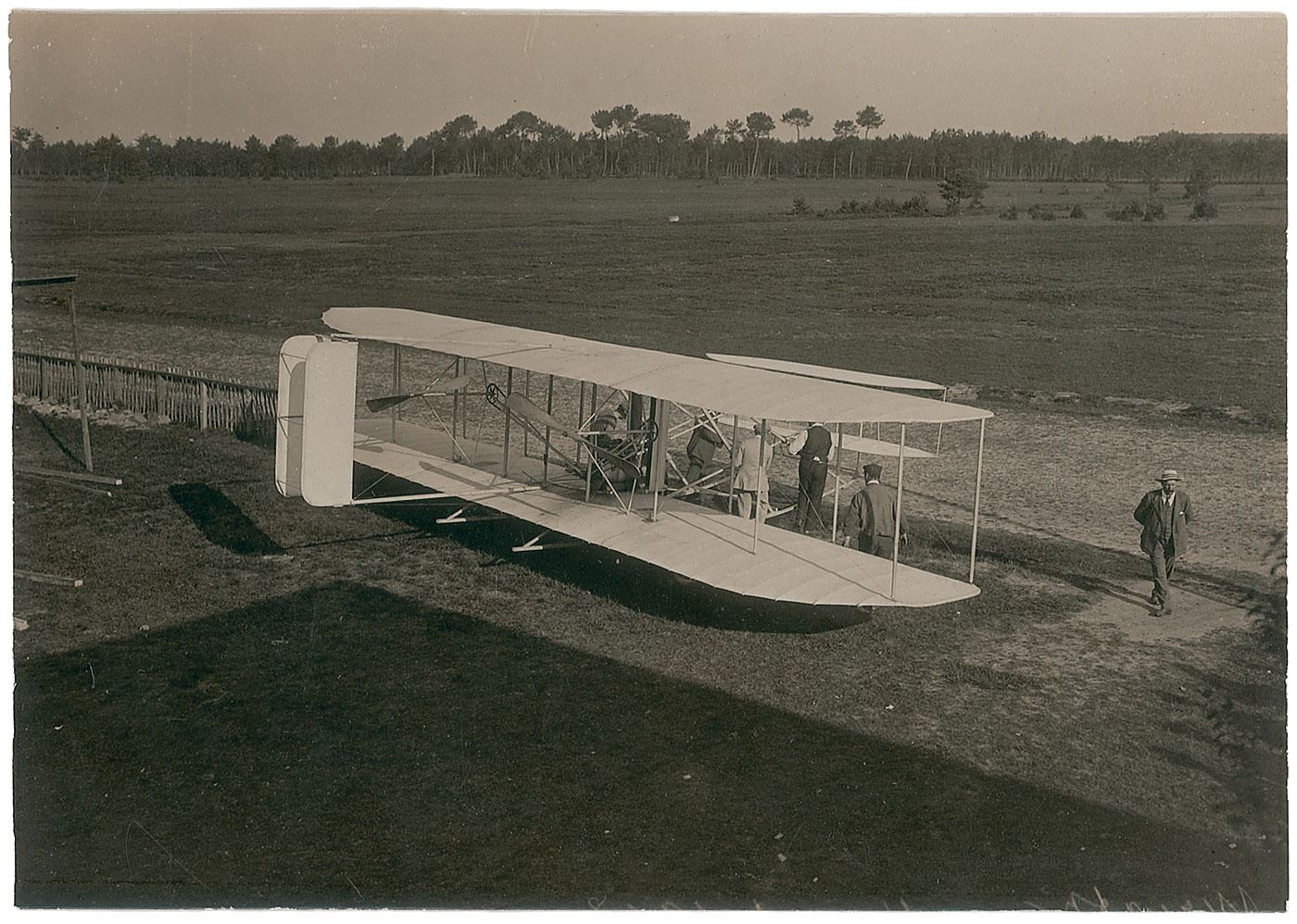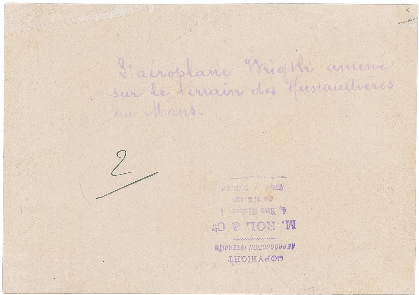 Original 6.5 x 4.5 press photo of Wright's Type A flyer on the ground at the Hunaudieres race course near Le Mans, France, in August of 1908. Reverse bears a handwritten French caption and an M. Rol & Co. photographer's stamp. In fine condition.