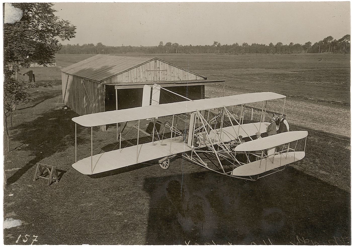 Original 6.5  x 4.5 press photo of Wright's Type A flyer parked outside a shed at the Hunaudieres race course near Le Mans, France, in August of 1908. Reverse bears a handwritten French notation. Two central vertical creases and a bit of light silvering to lower right, otherwise fine condition.