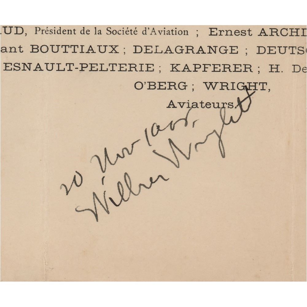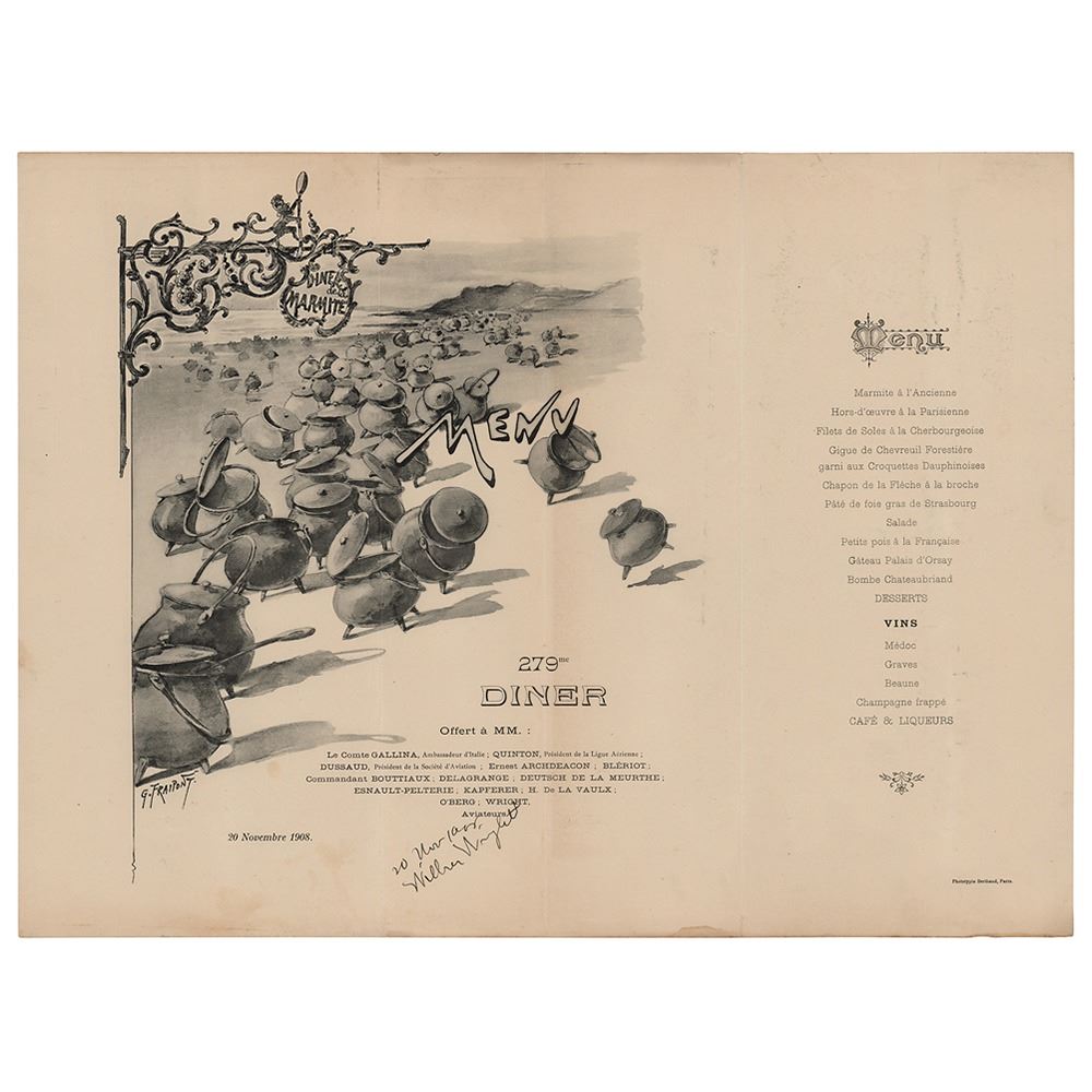 Menu created for a special "Diner de la Marmite" hosted for pioneering aviators on November 20, 1908, measuring 15.75 x 11.75 open, neatly signed at the bottom in ink, "20 Nov. 1908, Wilbur Wright." The printed text makes note of several of the attending luminaries, including Ernest Archdeacon, Louis Bleriot, Leon Delagrange, Henri Deutsch de la Meurthe, Robert Esnault-Pelterie, Henry de La Vaulx, and Wilbur Wright. In fine condition, with three vertical folds, and a small stain to the bottom edge.