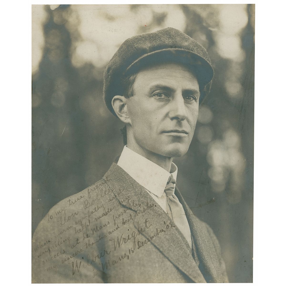 In order to secure a contract for their Flyer with a private French syndicate, the Wrights had to complete several public demonstration flights to prove that their plane could fly a distance of at least 50 kilometers with a passenger. After a captivating series of 1908 flights in Le Mans, far surpassing the requirements of the French contract, Wilbur was joined by Orville, who had been giving similar demonstrations in the US. This stunning portrait is inscribed to Leon Bolles, a French automaker who accompanied Wright as a passenger at Le Mans during a flight of four minutes and nine seconds on October 5, 1908—newspaper reports emphasized that Bolles weighed in at a hefty 216 pounds, yet the plane remained agile. The following day, Wright broke his own record for longest flight with a passenger, remaining aloft for 1 hour 4 minutes 26 seconds. It was this flight that secured the contract with M. Lazare Weiller's syndicate, awarding them a whopping $100,000. An extremely rare and absolutely stunning image of Wright with a great association to this important period in his career.