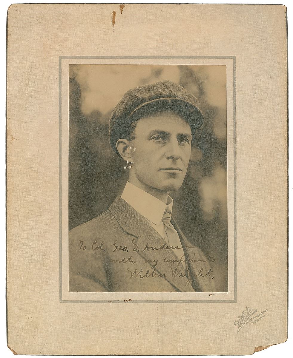 Vintage matte-finish 4.5 x 6.5 portrait of the elder Wright brother by New York’s White Studios, affixed to its original studio mount, signed and inscribed in fountain pen, “To Col. Geo. S. Anderson, with my compliments, Wilbur Wright.” In very good to fine condition, with light scuffing near Wilbur’s ear and light silvering to the darker portions of the image; the mat has a few small stains and missing lower corner tips, which could be tastefully matted out to great advantage. Accompanied by a full letter of authenticity from PSA/DNA. Before attaining rank of brigadier general, New Jersey-born George S. Anderson served as a colonel on different occasions between 1899 and 1903, a time period which approximately places this inscription to the years the Wright brothers were making final adjustments in preparation of their inaugural flight on December 17, 1903. Given his early death from typhoid fever in 1912, signed photos of the elder Wright are extremely scarce.