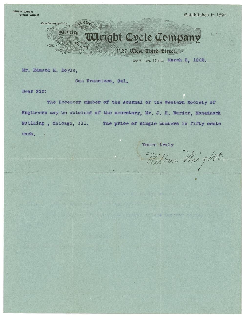 Typed letter signed, one page, 8.5'' x 11'', Wright Cycle Company letterhead, March 3, 1902. Letter to Edmund Doyle in San Francisco. In full: “The December number of the Journal of the Western Society of Engineers may be obtained of the secretary, Mr. J. H. Warder, Monadnock Building, Chicago, Ill. The price of single numbers is fifty cents each.” In very good condition, with intersecting folds, a vertical and horizontal fold through signature, small and very light stain over beginning letters of signature, small tear to top edge, light mirroring of type to bottom portion of page, and several small holes to page, none affecting signature or text. Accompanied by the original mailing envelope, missing part of the front panel. Pre-dating their historic first flight by more than a year, this letter references a lengthy piece that appeared in the aforementioned publication. In that piece, entitled “Some Aeronautical Experiments,” Wright discussed some of “the difficulties which obstruct the pathway to success in flying-machine construction,” giving detailed engineering insight into the topic that he admits to being “very simple in theory.” In that article, he goes through great pains to discuss an unmanned flight in 1900 at Kitty Hawk, a test run that would lead to a date with history. It’s no small wonder then that someone like Mr. Doyle, and presumably countless others, would want to read more about his experiments. With PSA/DNA COA.