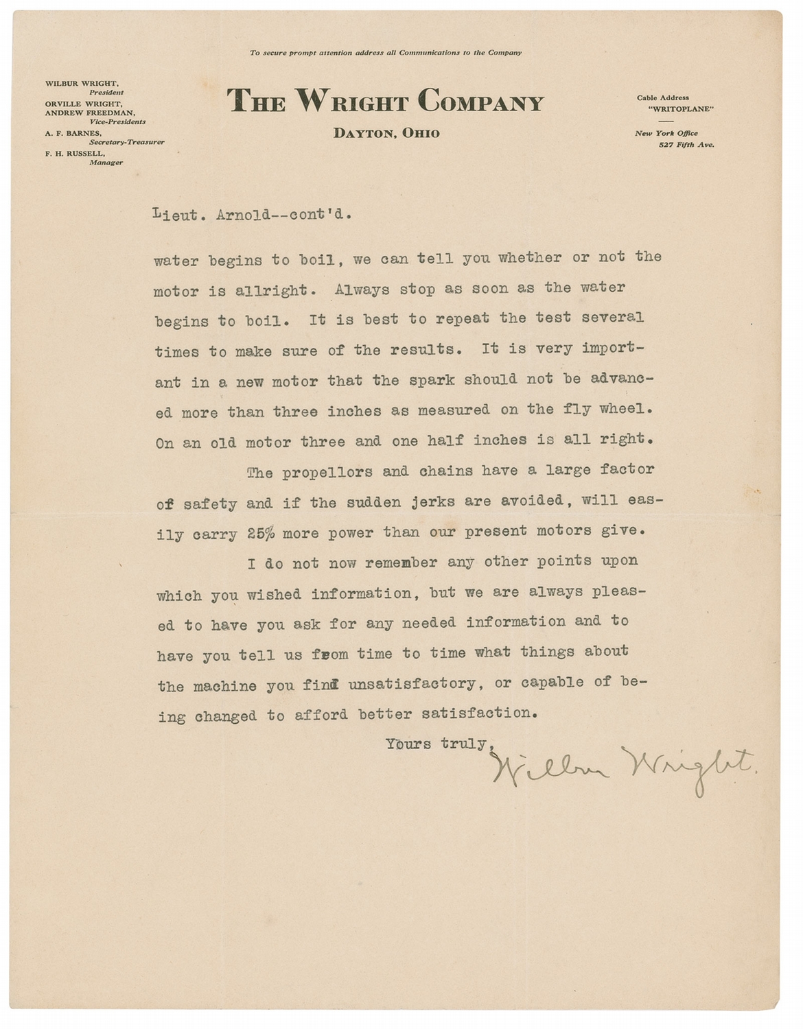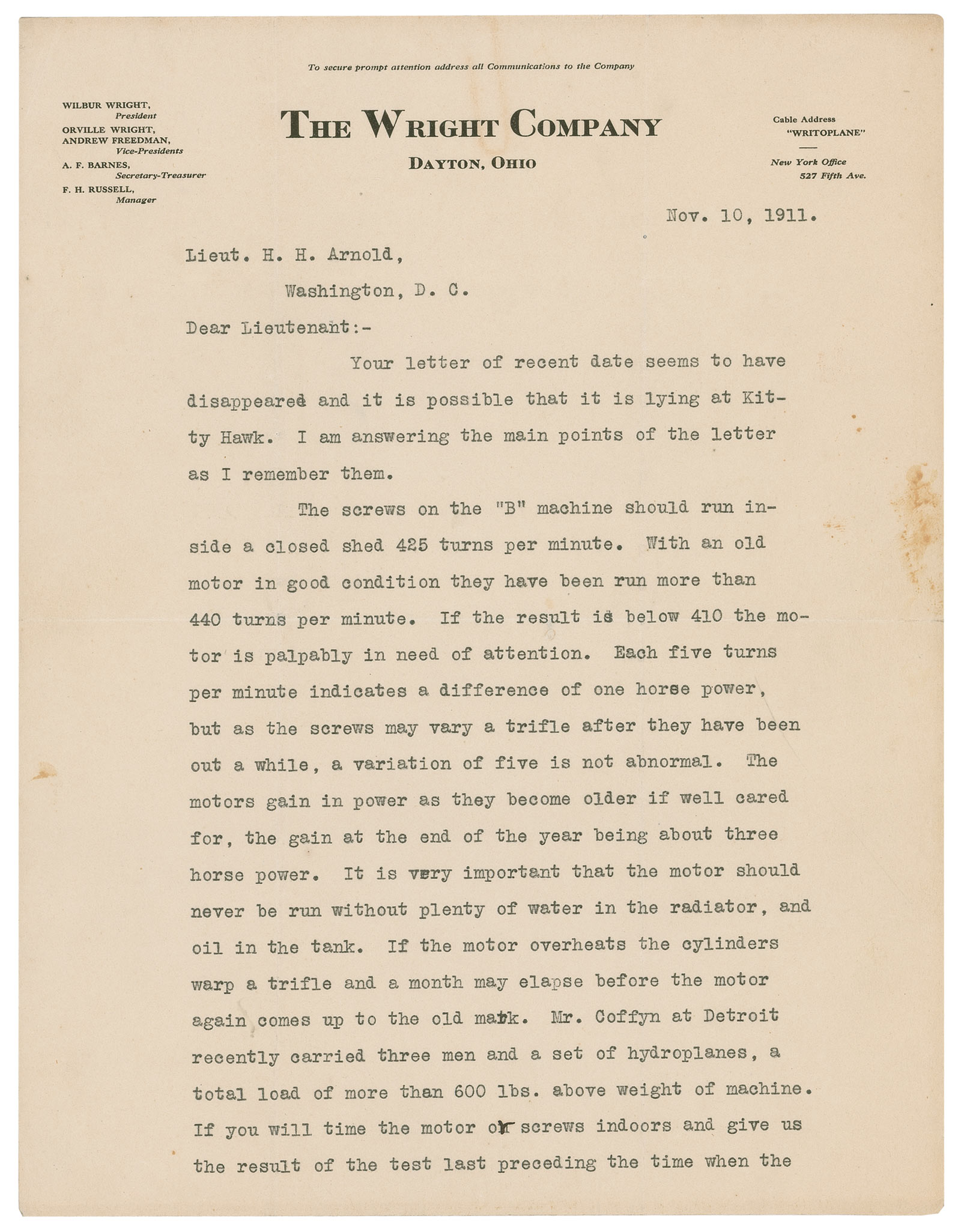 TLS, two pages, 8.5 x 11, The Wright Company letterhead, November 10, 1911. Letter to Lieutenant H. H. Arnold. In full: “Your letter of recent date seems to have disappeared and it is possible that it is lying at Kitty Hawk. I am answering the main points of the letter as I remember them.