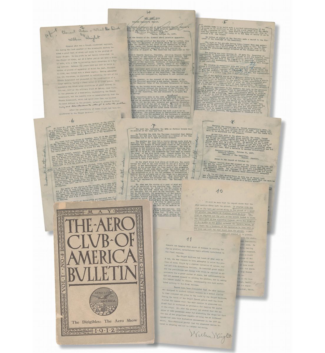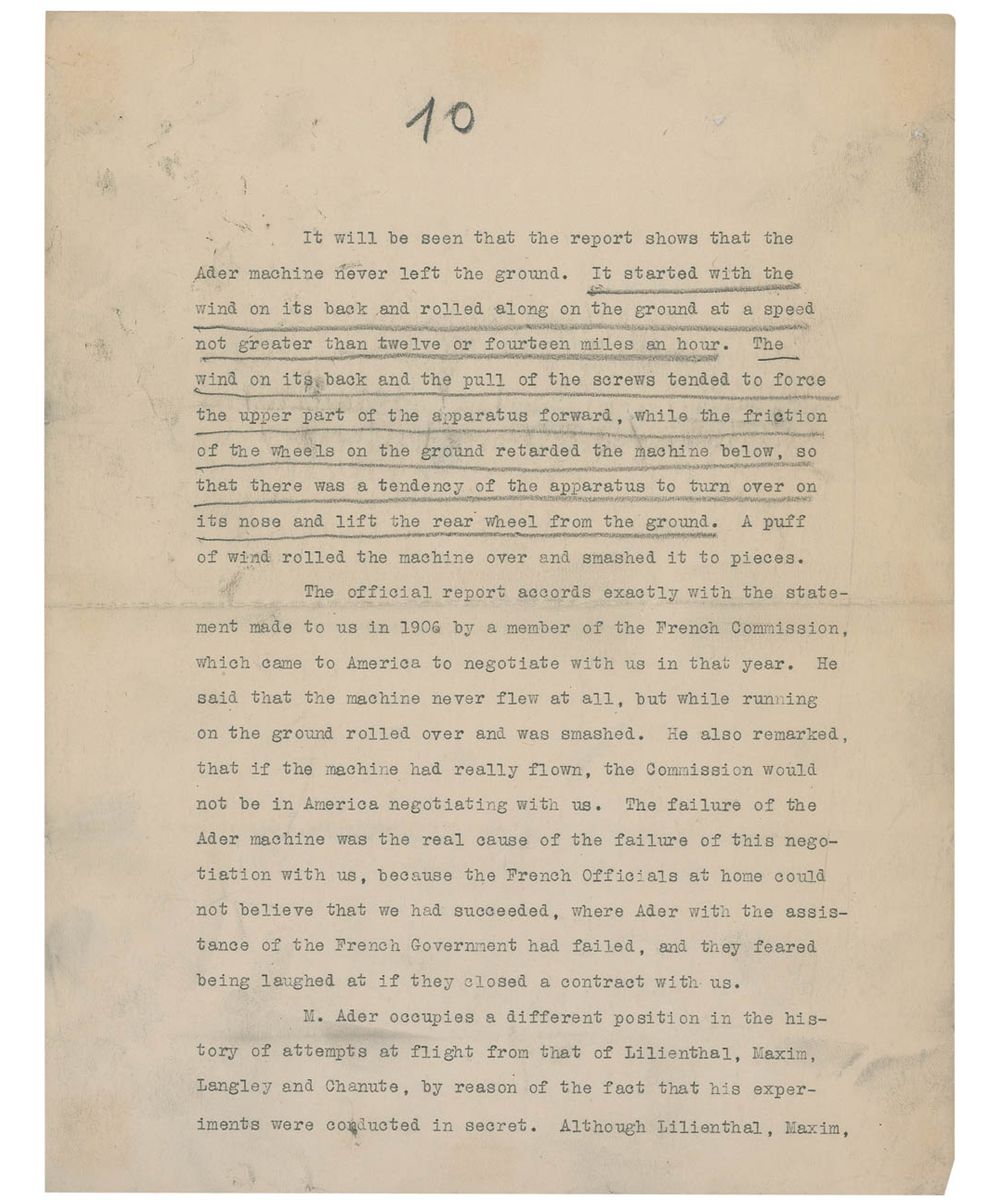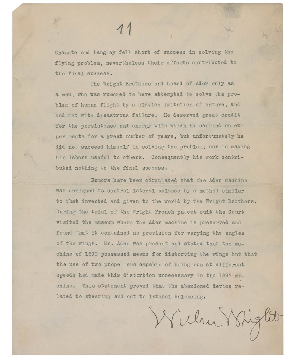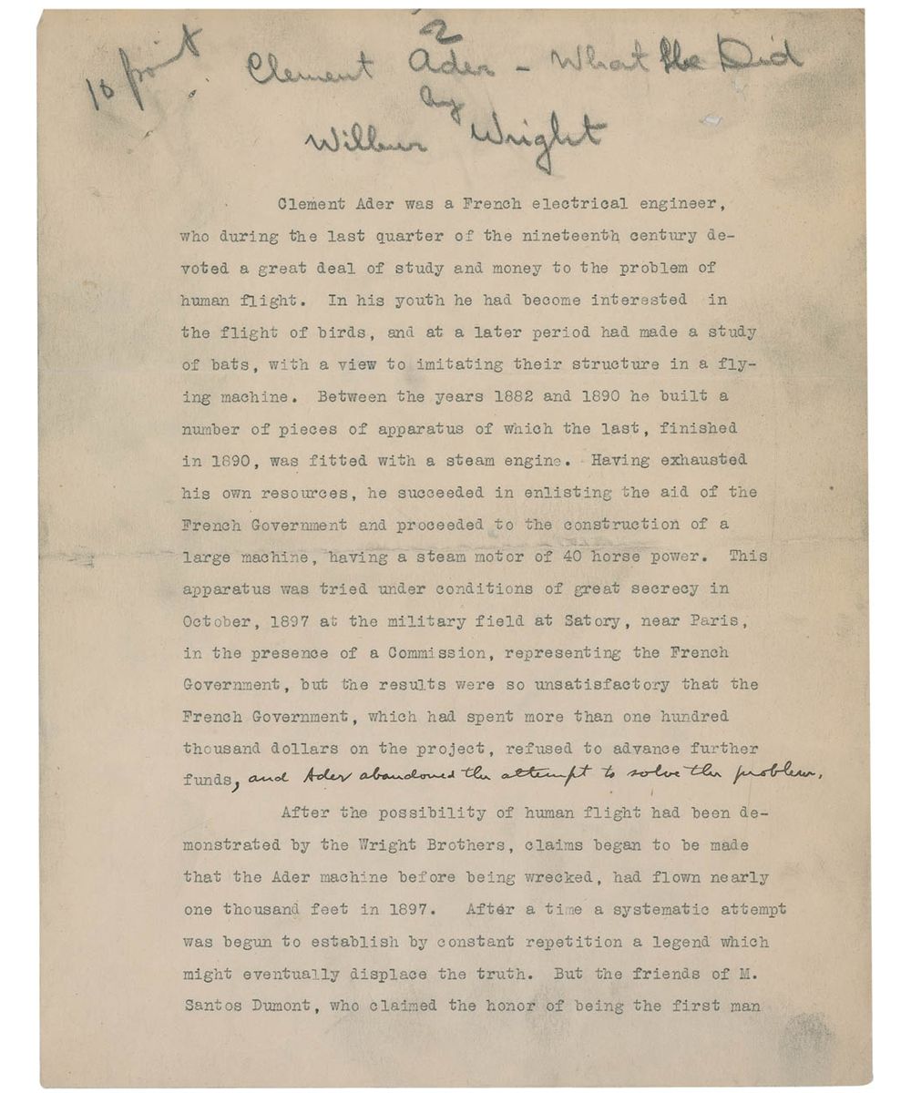 An amazing typed manuscript of an essay entitled “What Clement Ader Did,” which was published in the May 1912 edition of The Aero Club of America Bulletin, 10 pages, 8.5 x 11, signed on the last page in black ink, “Wilbur Wright,” with a couple of additional ink notations in the hand of his brother Orville Wright.