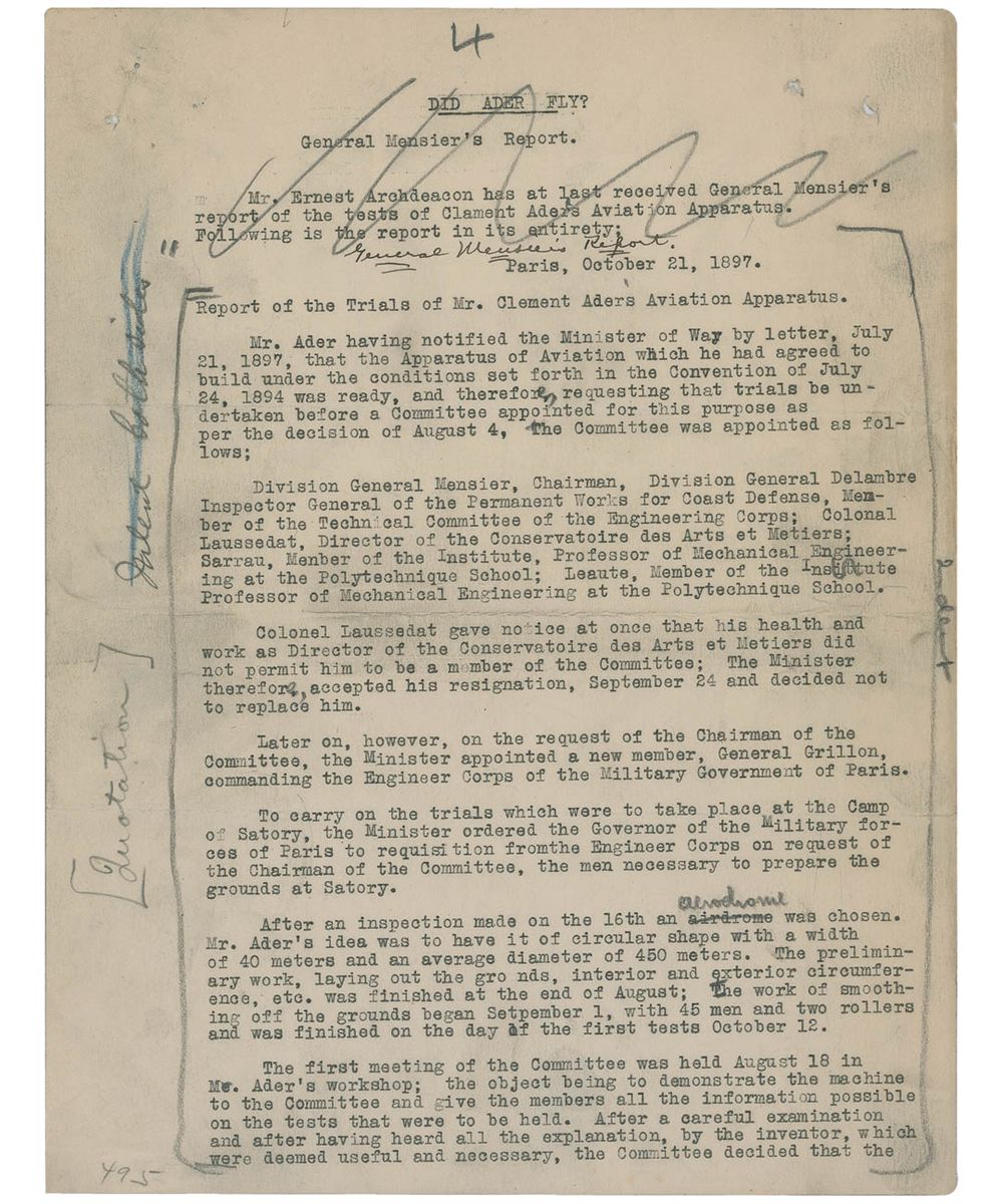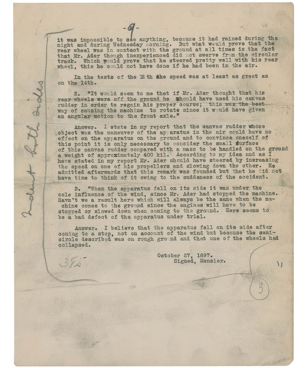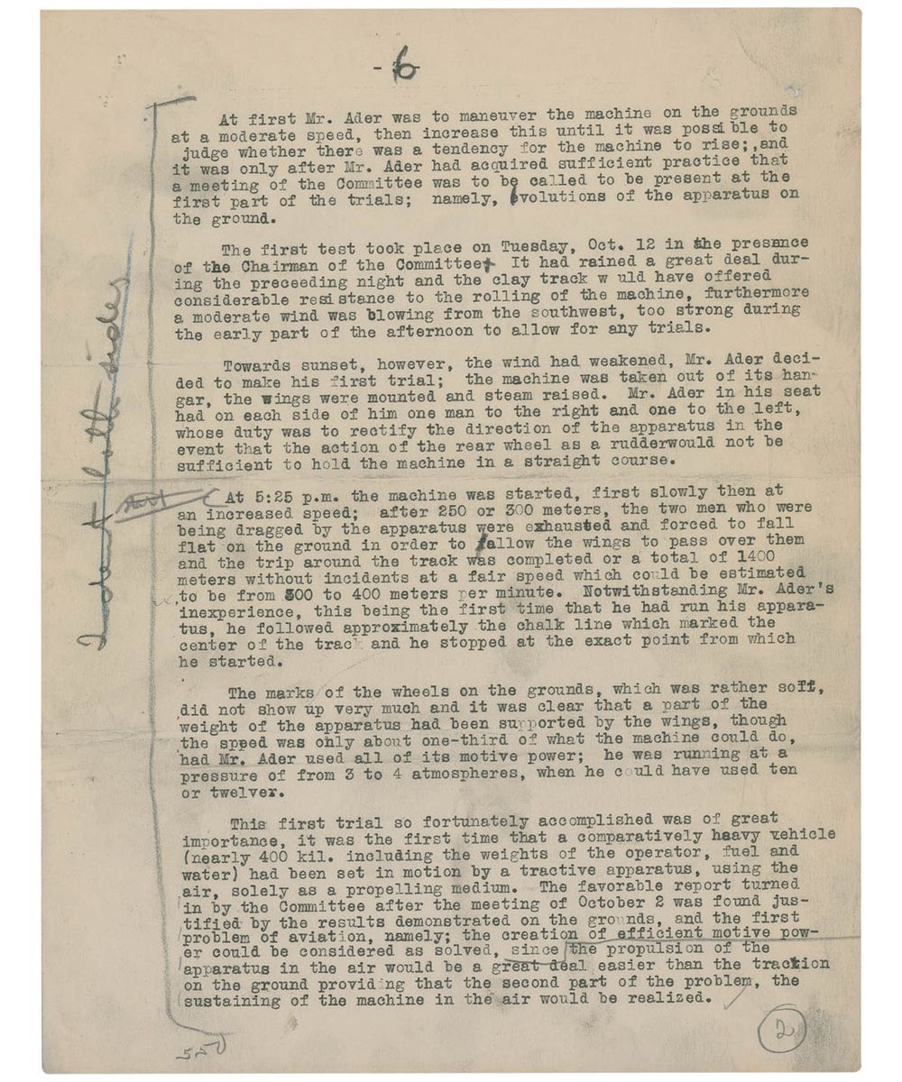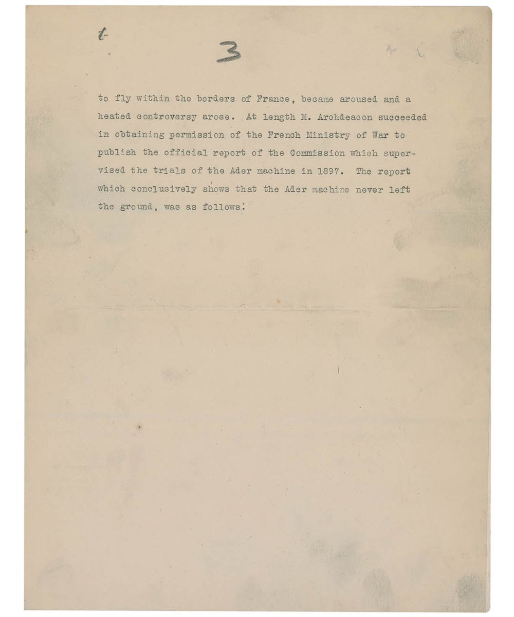 The last two pages of the essay contain Wilbur’s summation and conclusion, and read, in part: “It will be seen that the report shows that the Ader machine never left the ground. It started with the wind on its back and rolled along the ground at a speed not greater than twelve or fourteen miles an hour. The wind on its back and the pull of the screws tend to force the upper part of the apparatus forward, while the friction of the wheels on the ground retarded the machine below…A puff of wind rolled the machine over and smashed it to pieces. The official report accords exactly with the statement made to us in 1906 by a member of the French Commission, which came to America to negotiate with us in that year. He said the machine never flew at all…He also remarked that if the machine had really flown, the Commission would not be in America negotiating with us. The failure of the Ader machine was the real cause of the failure of this negotiation with us, because the French Officials at home could not believe that we had succeeded, where Ader with the assistance of the French Government had failed, and they feared being laughed at if they closed a contract with us…The Wright Brothers had heard of Ader only as a man, who was rumored to have attempted to solve the problem of human flight…and had met with disastrous failure…Consequently his work contributed nothing to the final success.” The essay also contains pencil notations and line by an unidentified editor from the Aero Club of America Bulletin.