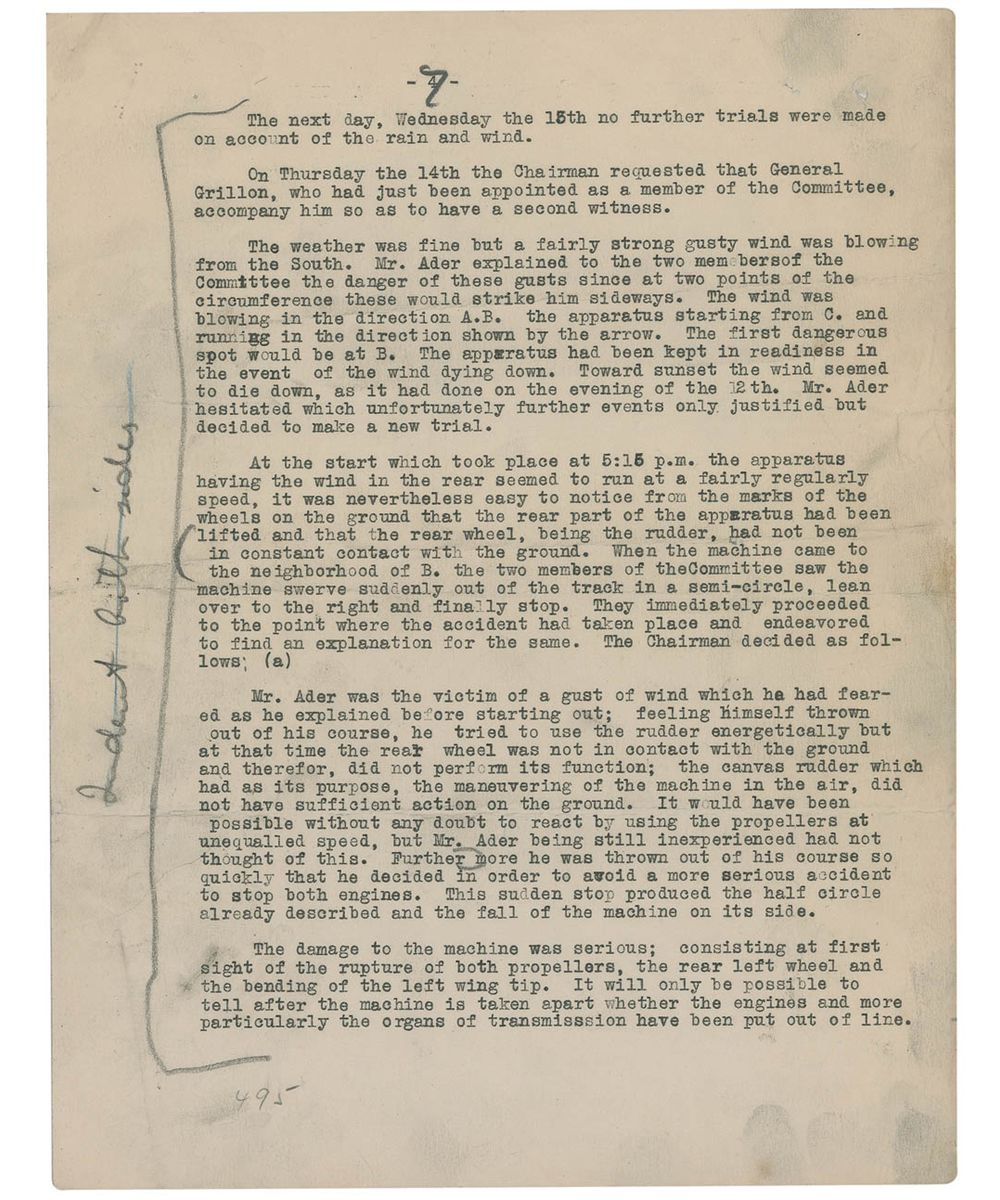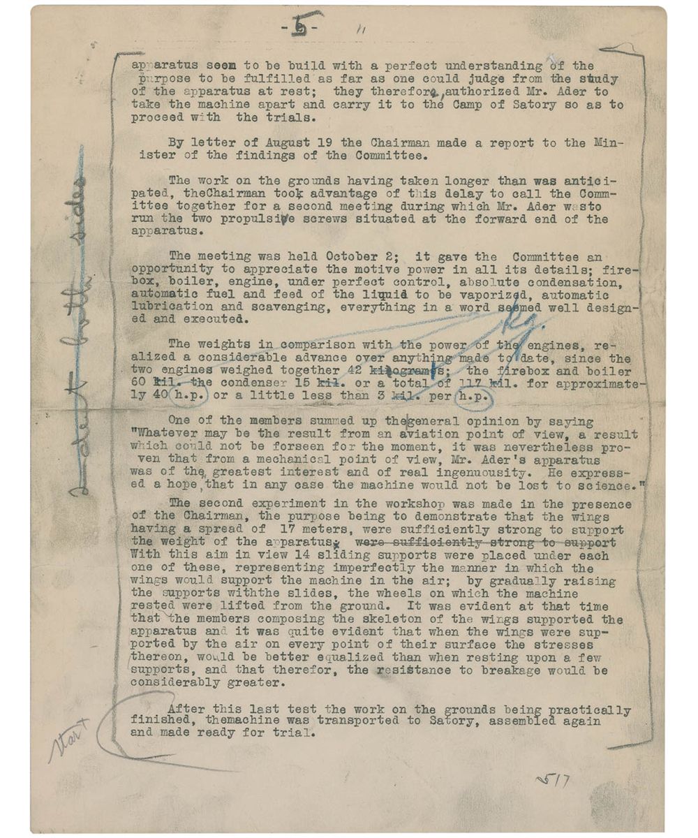 The essay continues “After the possibility of human flight had been demonstrated by the Wright Brothers, claims began to be made that the Ader machine before being wrecked, had flown nearly one thousand feet in 1897. After a time a systematic attempt was begun to establish by constant repetition a legend which might eventually displace the truth. But the friends of M. Santos Dumont, who claimed the honor of being the first man to fly within the borders of France, became aroused and a heated controversy arose. At length M. Archdeacon succeeded in obtaining permission of the French Ministry of War to publish the official report of the Commission which supervised the trials of the Ader machine in 1897. The report conclusively shows that the Ader machine never left the ground.” The following six pages of the essay show the results of the report.