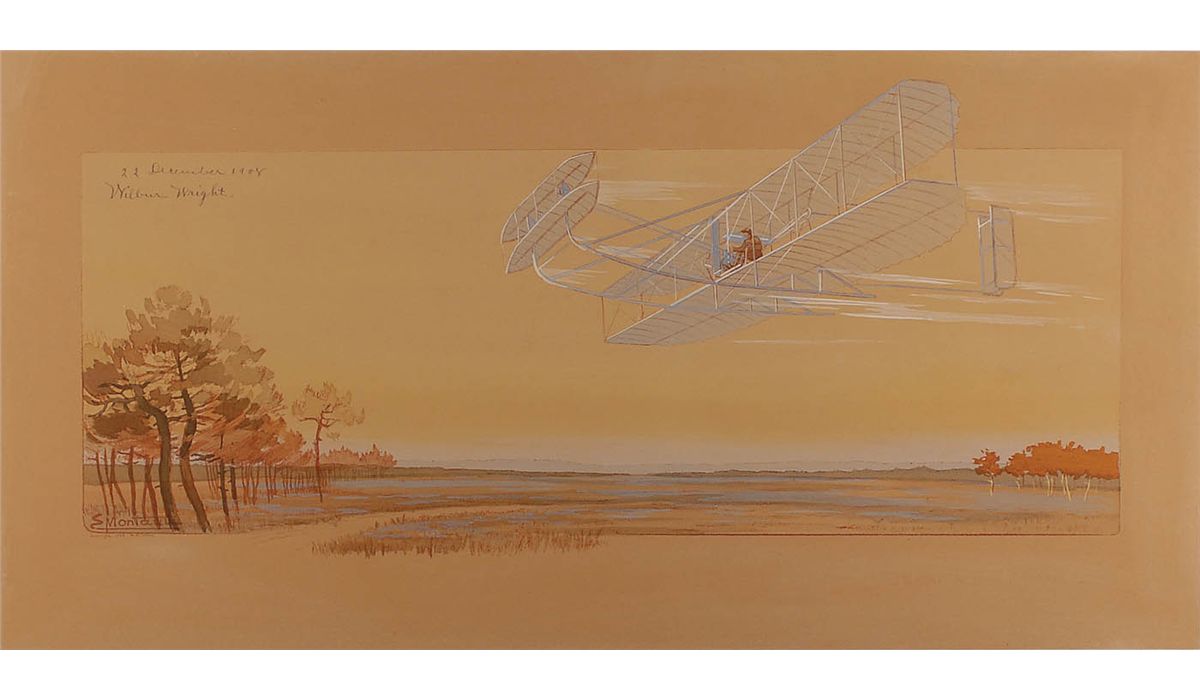 With rising European skepticism that the Wright brothers’ claims of flight had been inflated by the US, Wilbur Wright began official public demonstrations on August 8, 1908 at the Hunaudieres horse racing track near Le Mans, France. Immediately thrilling the French public and erasing any doubts of their achievement, Wright drew crowds of thousands to the small track, forcing him to relocate to the larger Camp d’Avours to accommodate the masses. He took to the air every day, breaking records as soon as he set them, and quickly became the most celebrated figure in Europe. Drawn in by the hype, artist Ernest Montaut—known for his innovative, action-packed prints of aviation and motor racing—created this print for sale at his studio, L’Estampe Sportive Artistique in Paris. The prints were produced by the pochoir process, in which the outlines were drawn onto lithographic stones and printed, then painstakingly colored using individual color stencils. This extraordinary lithograph, purchased and signed while the historic flights dominated the headlines, is the only of its kind that we have seen: an absolutely remarkable piece!