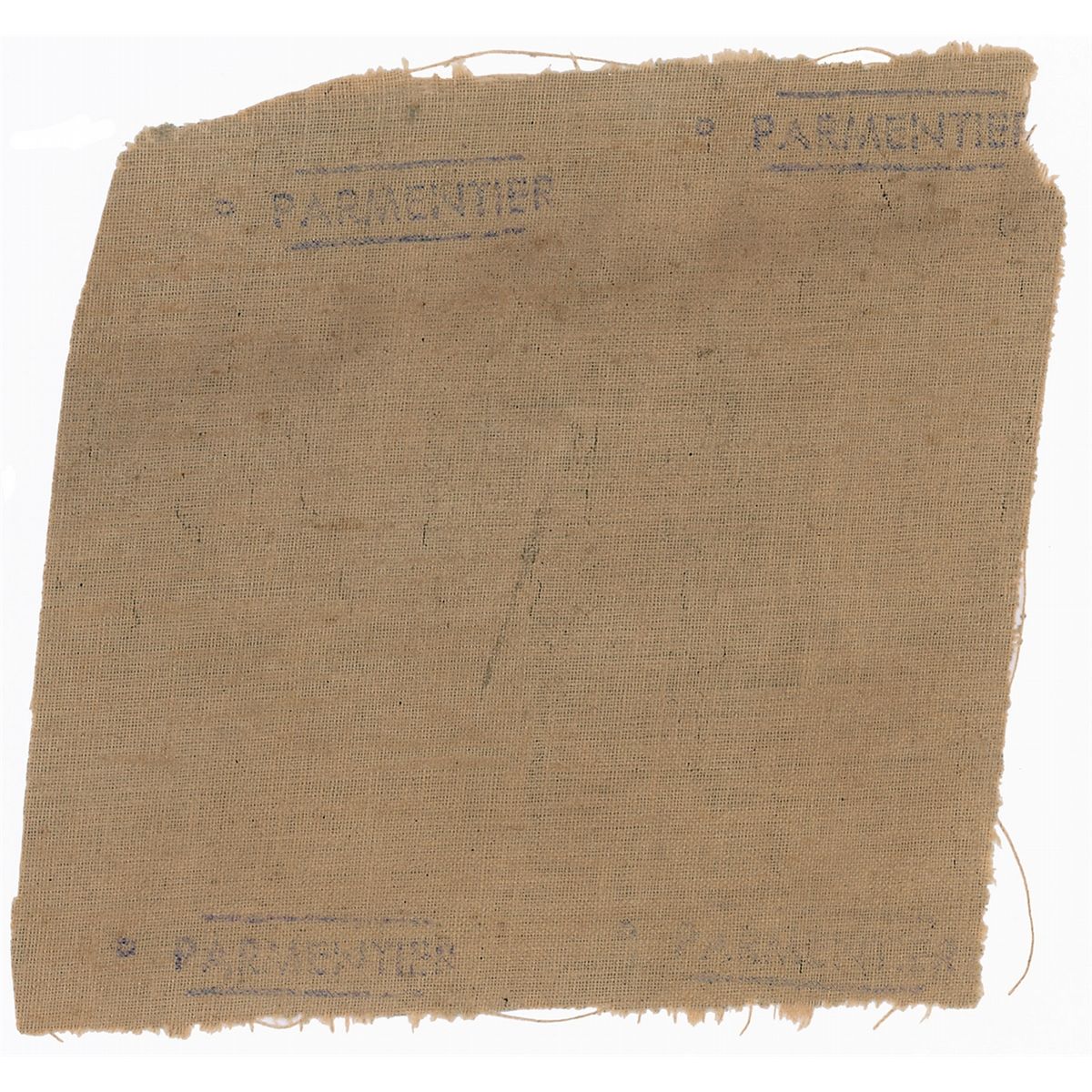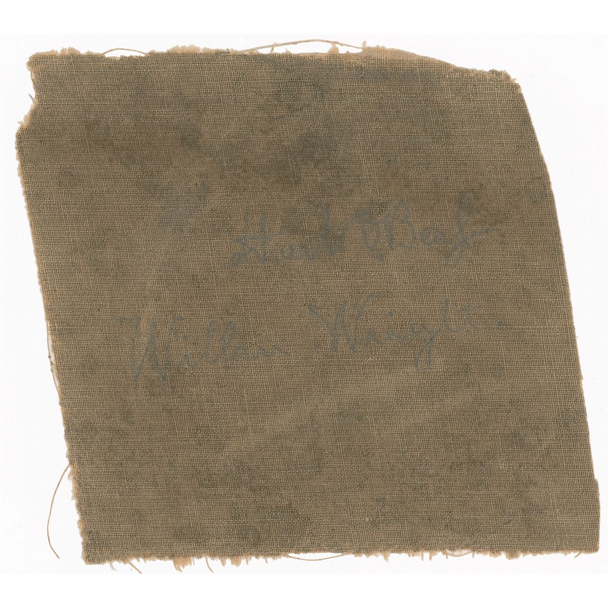 One-of-a-kind original swatch of fabric from the Wright Brothers’ damaged Model A Flyer, approximately 4 x 4, signed in pencil, “Wilbur Wright” and “Hart O. Berg.” Reverse bears four of the original collector's ownership stamps, "Parmentier," and swatch is accompanied by a similarly-stamped tag notated in black ink, "W. Wright, Buche aux Hunaudieres, 13 Aout 1908." In very good condition, with overall soiling and heavy contrast to signatures.