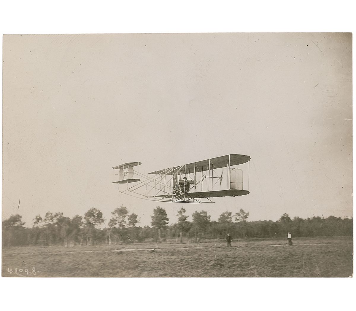 Original 6.25 x 4.5 photo of Wright piloting his flyer through the air near Le Mans, France, in August of 1908. Reverse bears an M. Branger, Paris, photographer’s stamp. In fine condition, with a slightly trimmed right edge and some mild soiling along upper right.