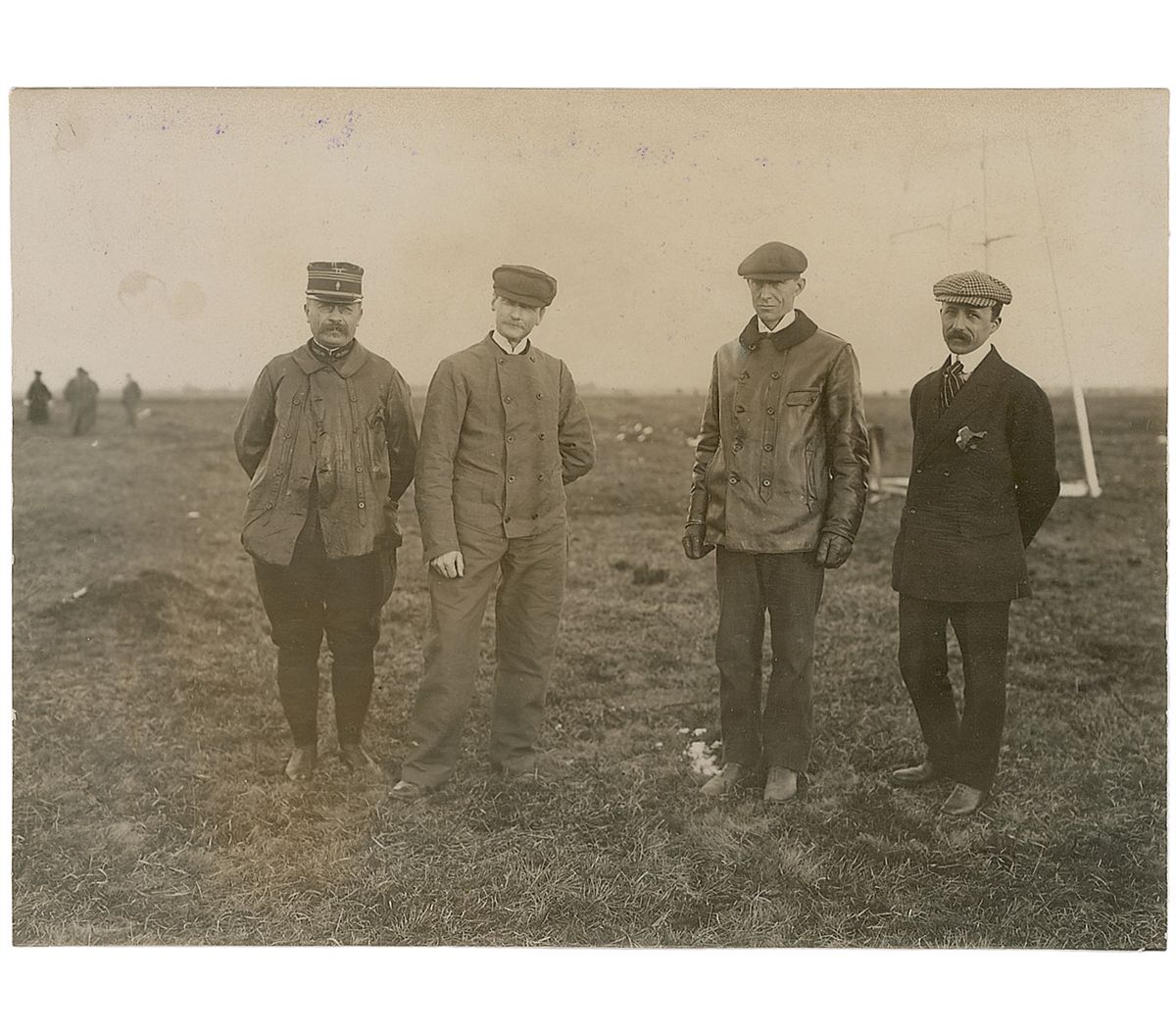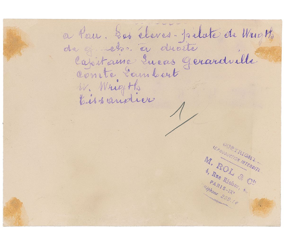 Original 6.5 x 4.75 press photo of Wright standing with Paul Tissandier and student pilots Captain Paul N. Lucas-Girardville and Count Charles de Lambert, taken in early 1909 in Pau, France. Reverse bears a handwritten French caption and an M. Rol & Co. photographer’s stamp. In fine condition, with some scattered light creases, small mounting remnants to reverse, and a bit of slight bleed-through along top edge from ink on reverse.