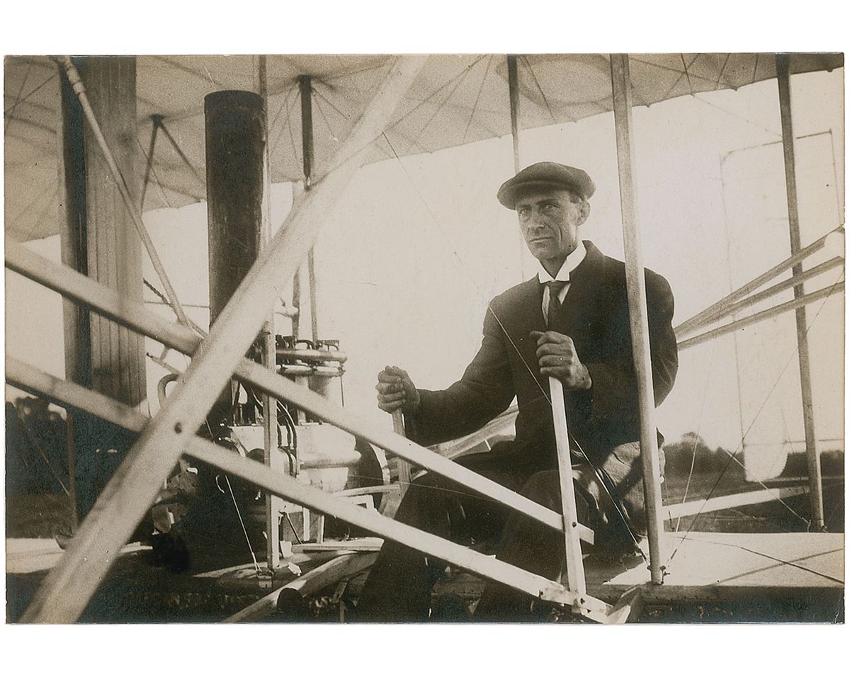 Original 7 x 4.75 press photo of Wilbur seated in his Wright Type A at the Hunaudieres race course near Le Mans, France, in August of 1908. Reverse bears handwritten French notations and two H. Roger Violett photographer’s stamps. In fine condition, with a bit of scattered light silvering, visible only at an angle.