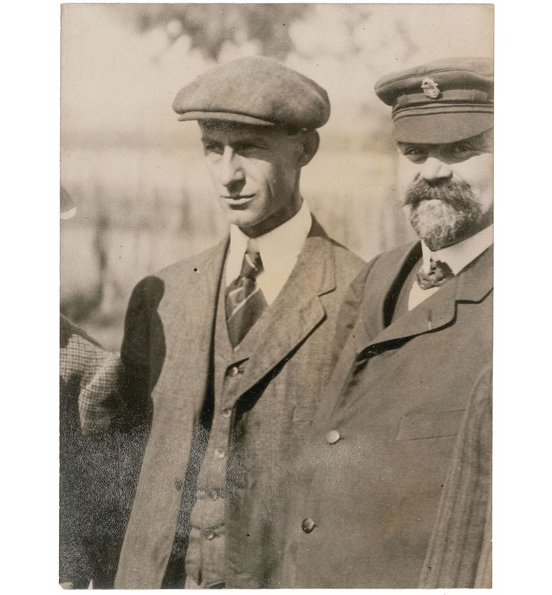 Original 5 x 6.75 photo of Wilbur standing outdoors alongside French inventor and automobile manufacturer Leon Bollee. Reverse bears a small pencil notation that is dated 1908. Light discoloration to lower left of image, mounting remnants to reverse, and a few mild ripples, otherwise fine condition. Bollee let the Wright Brothers use his factory in Le Mans when they came to France to demonstrate their aircraft.