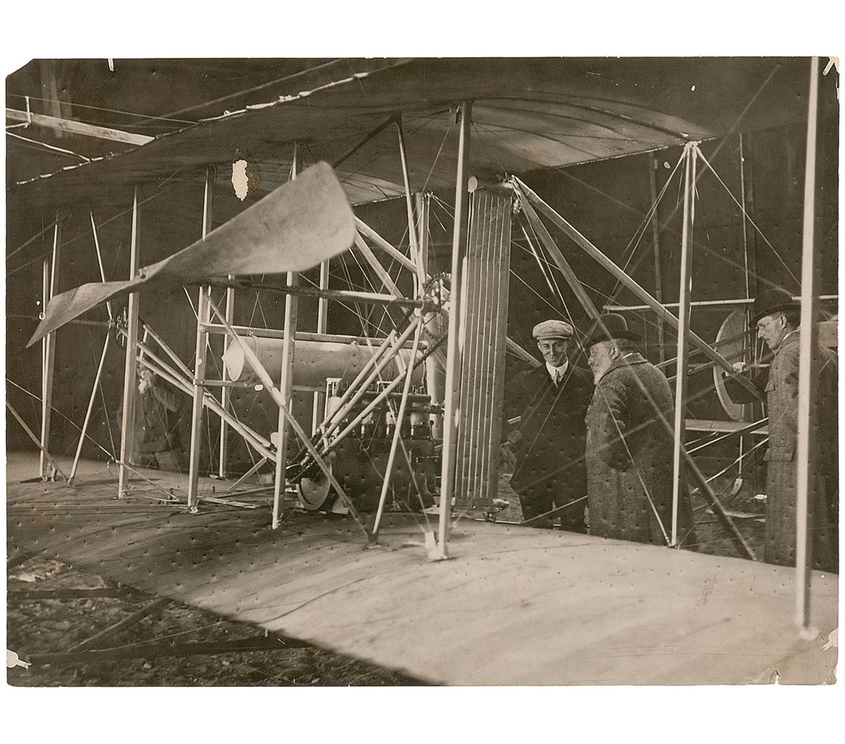 Original glossy 8.5 x 6.5 press photo of Wilbur showing his Wright flyer to King Edward VII of England in Pau, France, in March of 1909. Reverse bears a brief pencil notation and several stamps, including one from the Daily Mirror. In fine condition, with a few corner tip dings, missing top left corner tip, and a few light creases.