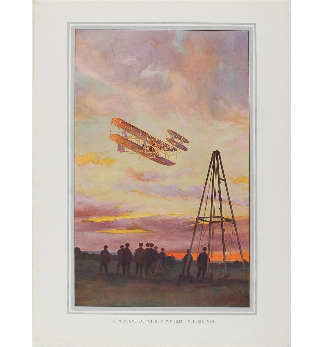Gorgeous color 12.25 x 16.5 print entitled ‘L’Aeroplane de Wilbur Wright en Plein Vol,’ showing a beautiful painting by A. Serougart of a small crowd admiring Wright’s biplane soaring in the sunset-lit sky. In fine condition, with toning to left edge and light handling creases.
