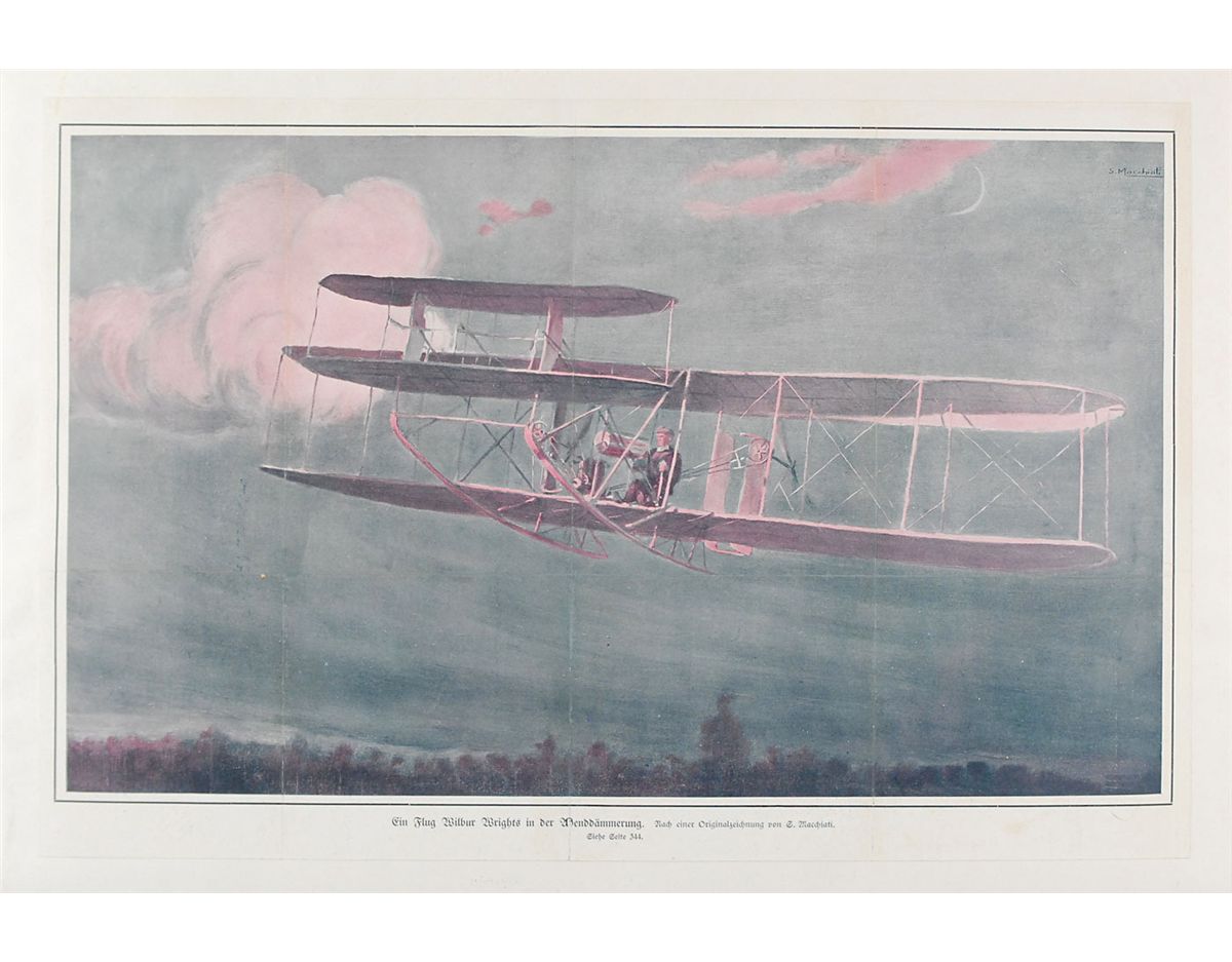 Early German color 18.5 x 12.25 print entitled ‘Ein Flug Wilbur Wright in der Abenddämmerung,’ based on an original drawing by S. Macchiati, featuring a wonderful image of Wright piloting his biplane in the twilight. Professionally linen-backed for preservation. In very good condition, with smoothed intersecting folds and restorations to small chips and separations.