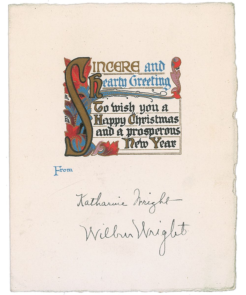 Eye-catching embossed Christmas card, measuring 4 x 5 closed, with an illuminated Christmas greeting printed on the cover which reads, “Sincere and hearty greetings to wish you a Happy Christmas and a prosperous New Year.” Signed below the greeting in black ink, “Katharine Wright,” and “Wilbur Wright.” In fine, clean condition. A less-common format than usually seen featuring Katharine.