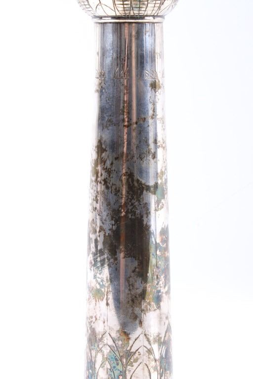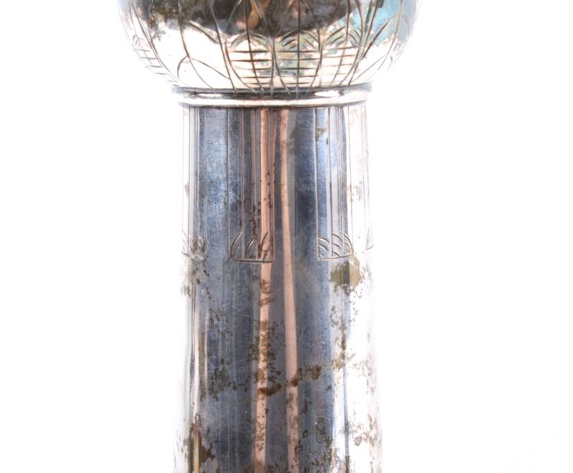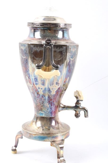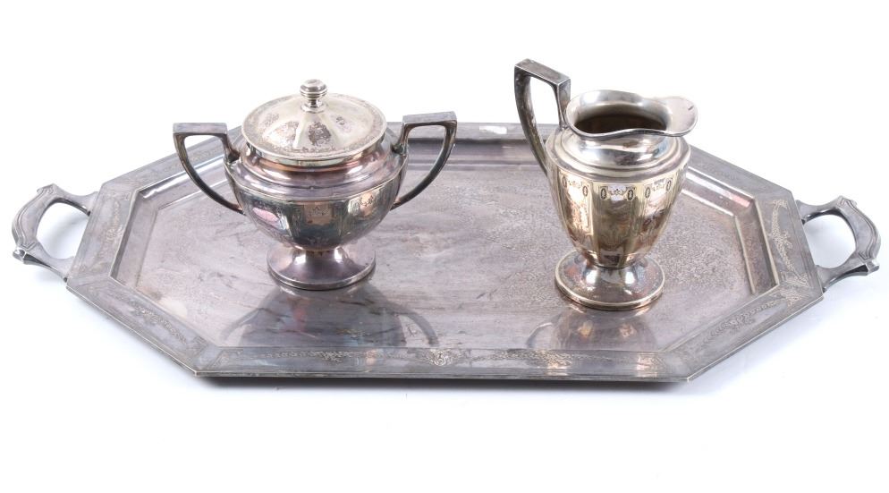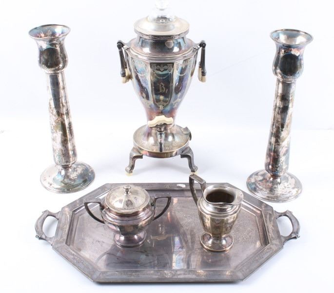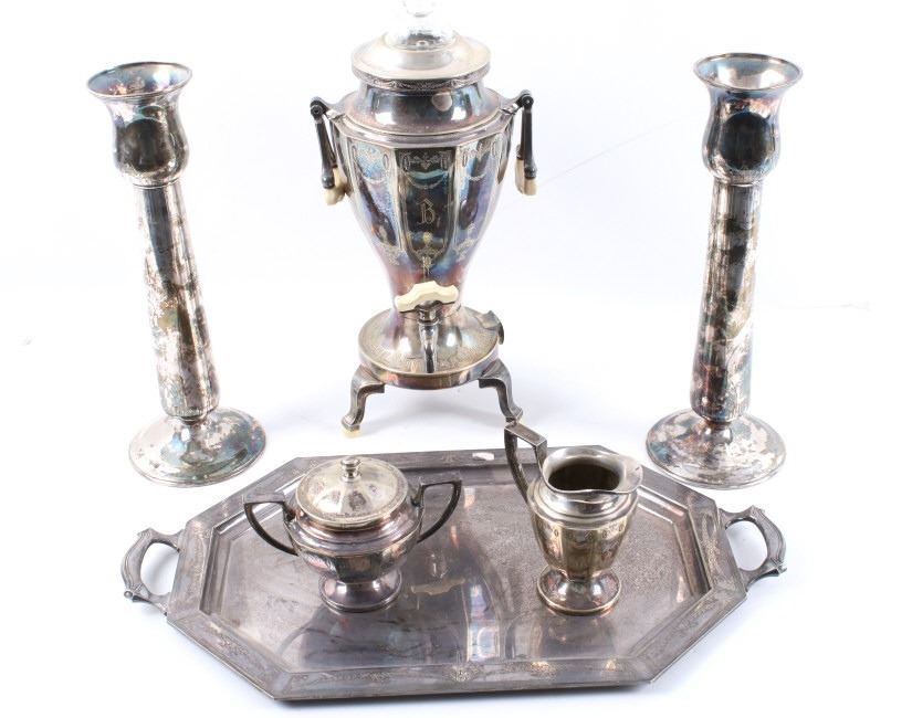 Featured in this lot we have a set of Wilcox Silver Plate Company serving collection and pair of candle sticks. The collection consists of a serving tray, sugar cup, creamer, coffee pot, and a pair of candle holders. The collection shows silver plated construction and each are marked across the bottom reading "Wilcox S.P. Co. International S. Co. Made in US America" with the sugar cup and creamer marked "SPNS Universal Made in USA". The pieces show geometric designs etched into each piece. The coffee percolator shows a internal brew basket and electronically heated. The collection shows good condition overall with some discoloration and warm patina. The percolator measures 16 1/2" tall by 8" wide with the candle sticks measuring 14 1/4" tall with the base measuring 5" in diameter and the serving tray measures 21 1/2" wide by 12" deep.