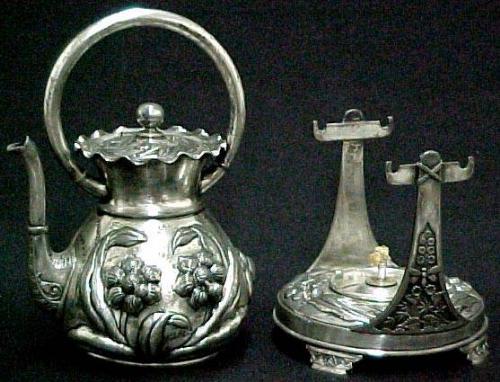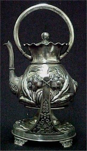 Wilcox quadruple plated swing kettle on stand; round hollow handle over hinged lid with button finial; scalloped rim; repousse floral and foliage design; impressed mark on bottom; late 19th C. (some surface loss)