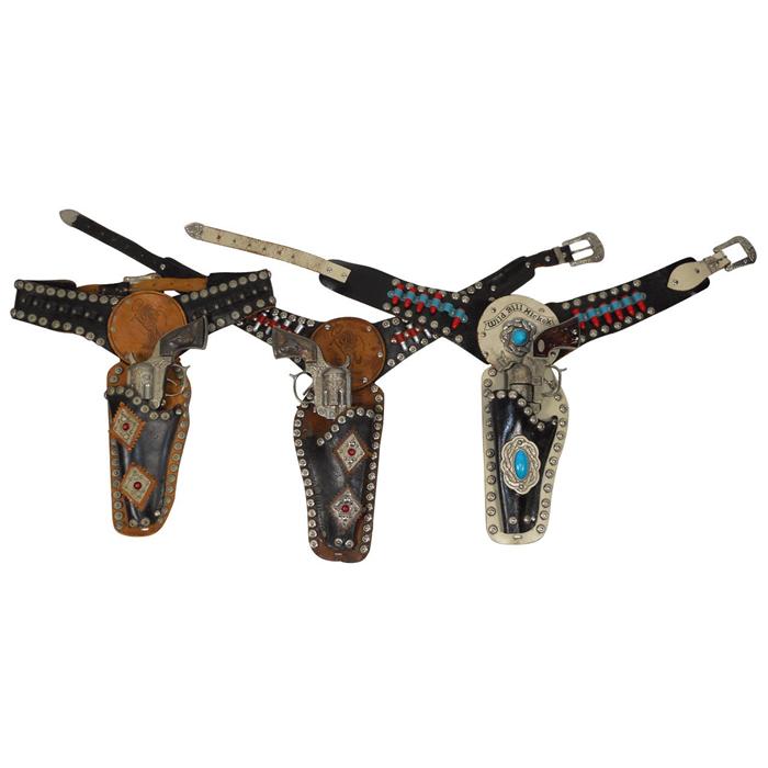 Wild Bill Hickok cap guns w/holsters (3), gun in single holster reads Marshal Wild Bill, mfgd by R&R, VG orig cond, another single holster reads WBH w/Wild Bill Hickok 44's by Halco, 1950's, VG orig cond.