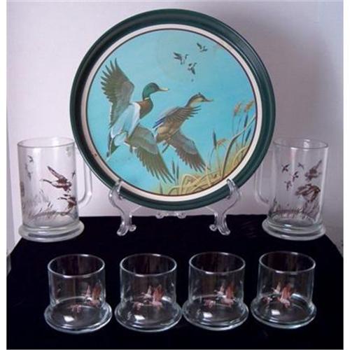 4 Beer Mugs, 4 Old Fashions, 4 Coasters and a 12" Round Tray... all matching. The pattern is "Mallards in Flight" and was designed by Avon in 1982. The tray shows its' age with a couple of rust spots and a light stain, but the glasses are all in top shape with no chips or cracks. A great buy!!! Order three of anything that we can ship in one container, pay with PayPal and shipping is FREE...