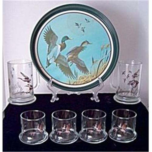 4 Beer Mugs, 4 Old Fashions, 4 Coasters and a 12" Round Tray... all matching. The pattern is "Mallards in Flight" and was designed by Avon in 1982. The tray shows its' age with a couple of rust spots and a light stain, but the glasses are all in top shape with no chips or cracks. A great buy!!!