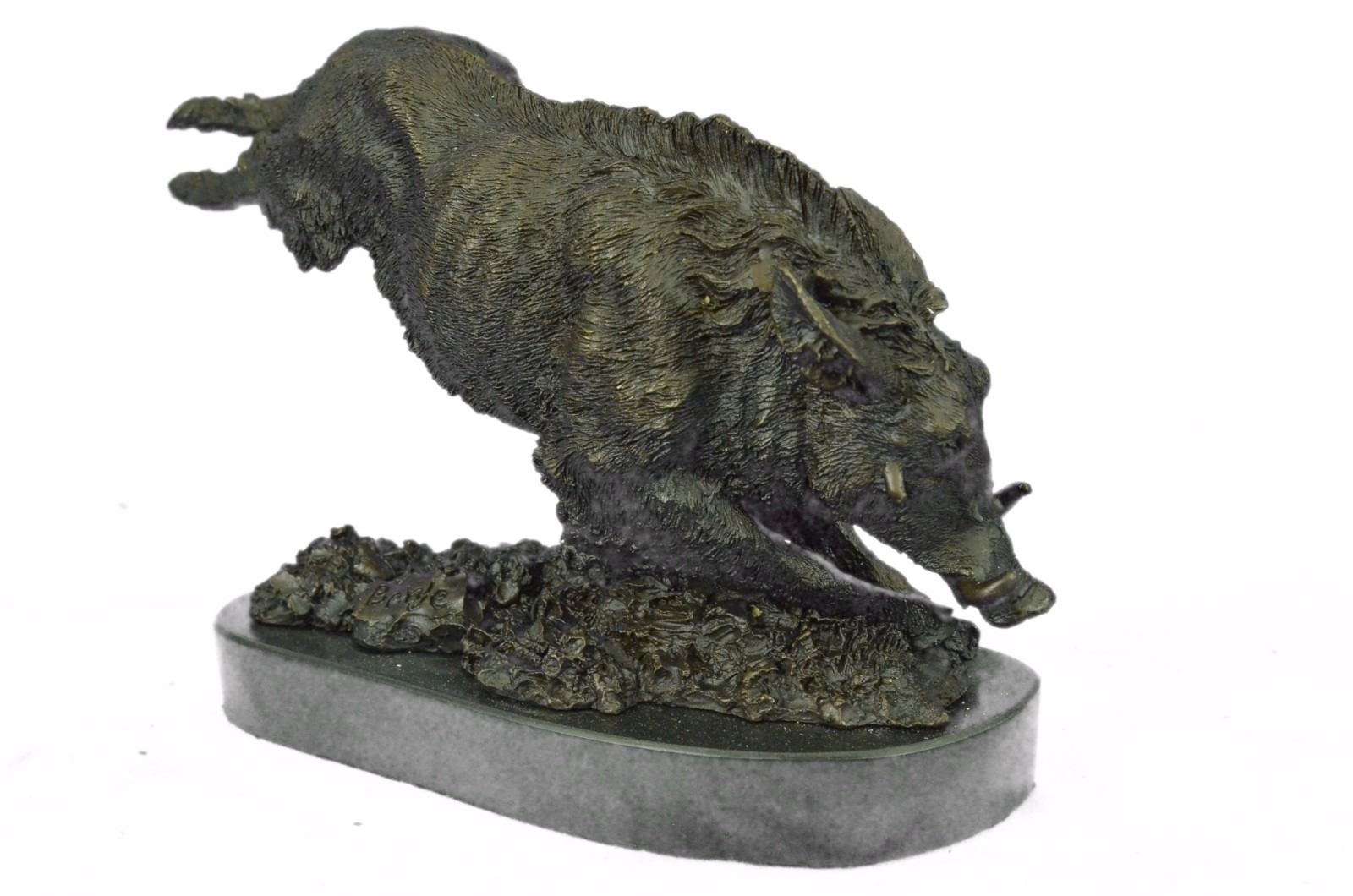 The body of the wild boar is compact; the head is large, the legs relatively short. The fur consists of stiff bristles and usually finer fur. The colour usually varies from dark grey to black or brown, but there are great regional differences in colour; even whitish animals are known from central Asia. During winter the fur is much denser. Adult boars average 180 cm in length and have a shoulder height of 90 cm. As a whole, their average weight is 70 Kilograms 150 pounds, though boars show a great deal of weight variation within their geographical ranges. In central Italy their weight usually ranges from 80 to 100 kg; boars shot in Tuscany have been recorded to weigh 150 kg (331 lb). A French specimen shot in Negremont forest in Ardenne in 1999 weighed 227 kg (550 lb). Carpathian boars have been recorded to reach weights of 200 kg (441 lb), while Romanian and Russian boars can reach weights of 300 kg (661 lb). This boar hog is running as fast as he cant before the hunters catch him, he watches his back with his eyes rearing behind him to see who is behind him. The handmade bronze sculpture was cast using the age old method of lost wax casting and stained with a brown patina finish for preservation. It is mounted upon a black marble base. Bronze Dimensions with Marble Base: Height 8 X Width 12 inches. Weight: 10 LBS. Please Note: This is a reproduction bronze sculpture from the original molded and signed. This featured bronze sculpture is a recast after the original, and has been done recently. This 100% bronze sculpture is an abstract piece certain to be a conversation piece.Please Note: This is a reproduction bronze sculpture from the original molded and signed. This featured bronze sculpture is a recast after the original, and has been done recently. This 100% bronze sculpture is an abstract piece certain to be a conversation piece.