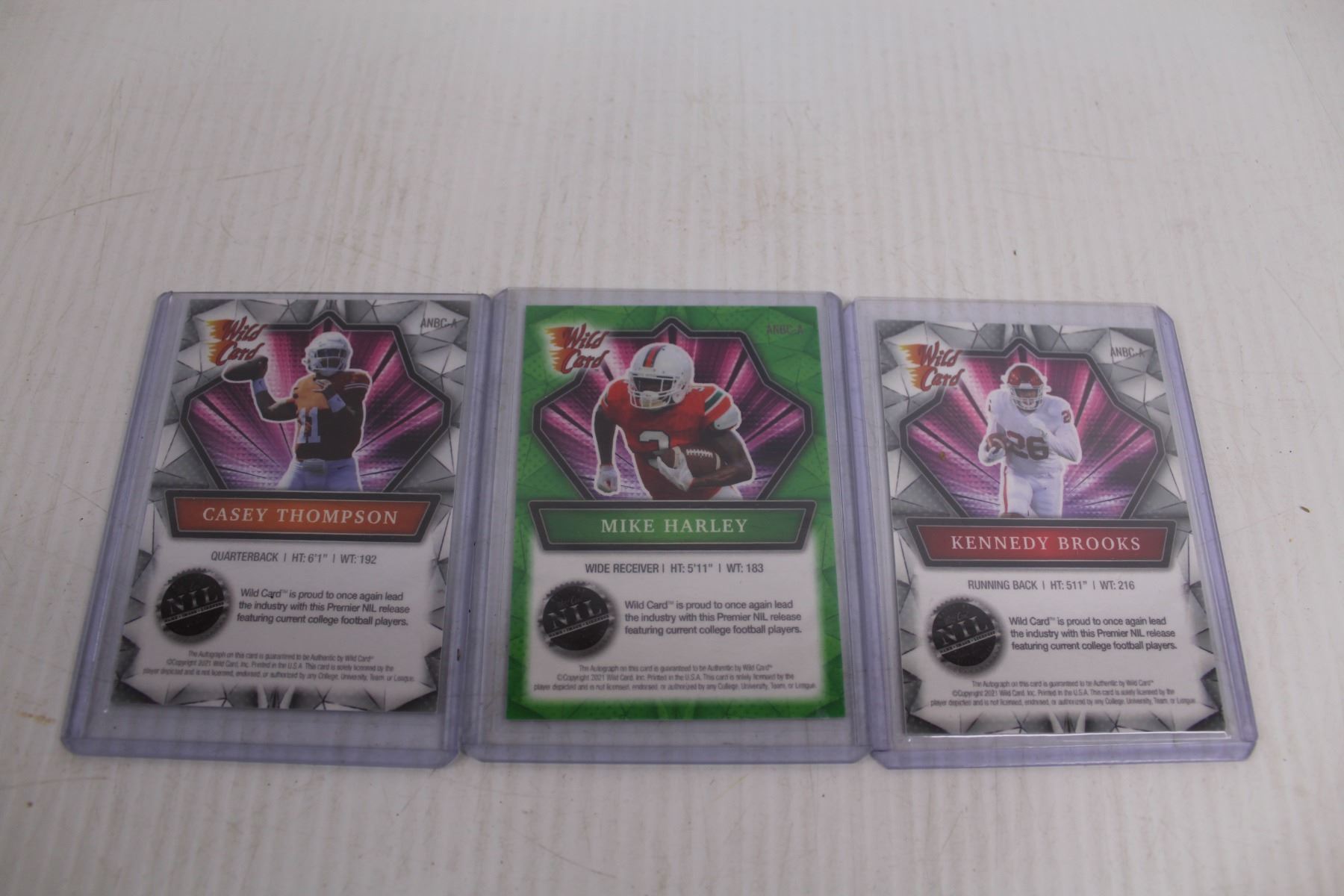 Wild Card NFL Cards: Holo-Lux Kennedy Brooks Autograph Card #33/99, Holographic Casey Thompson Autograph Card, & Holo Lux Mike Harley Autograph #10/45