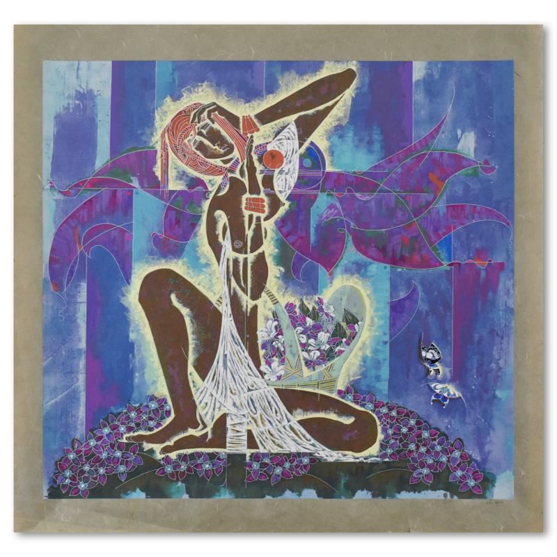 "Wild Flowers" is a limited edition serigraph on rice paper by Lu Hong, numbered CV/CL and hand signed by the artist. Includes Letter of Authenticity. Measures approx. 40" x 37.5" (with border), 33" x 32" (image). Please note: there is a small horizontal tear (and crease) on the bottom-center border area that may be concealed when framed.