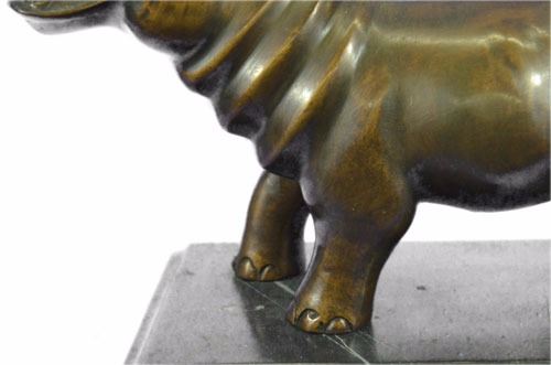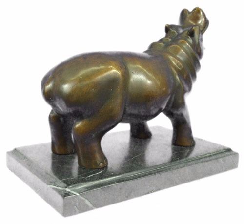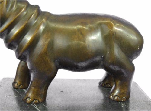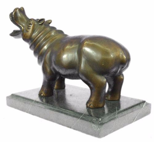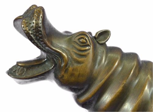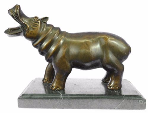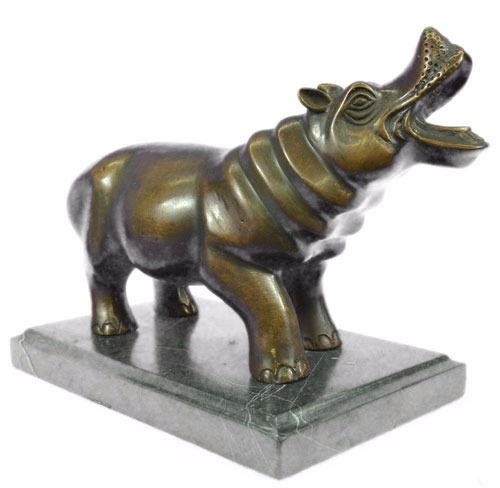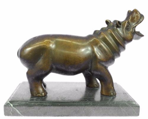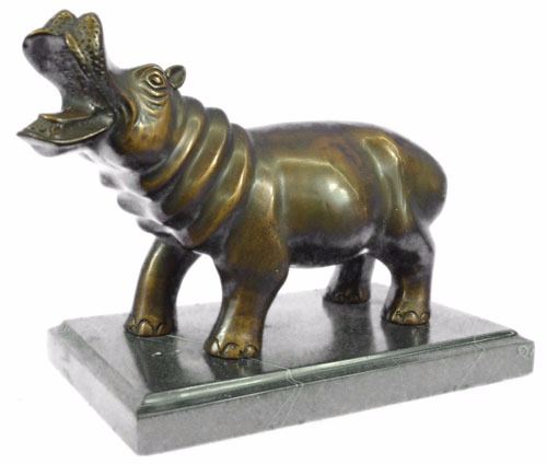 One Of The Most Unique Looking Animals, The Hippopotamus Stands Out In A Crowded River. They Dwell In Water And Mud Mostly, To Stay Cool During The Hazy Days. They Emerge At Dusk To Graze. Despite Their Physical Resemblance To Pigs, Their Closest Living Relatives Are Surprisingly Whales And Porpoises From Which They Diverged About 55 Million Years Ago. This Playful Hippo Emerges From The Muddy Lake And Yawns. His Mouth Opens Wide, Giving You A Good Look At His Large Tongue. He Has A Shiny Brown Patina With Gold Details. 100% bronze sculpture, this brown patina sculpture was cast using the "lost wax method" and mounted on a black marble base. This sculpture is very interesting a bronze recast based on the original piece. a decorative brown patina bronze sculpture size: 8X12 inches.