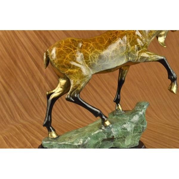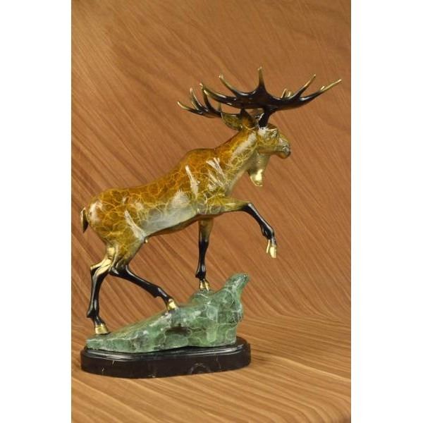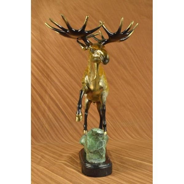 This bronze sculpture depicts a moose eating the wet grass from a lake. He bends down into the water keeping his hind legs on high dry ground just in case anything decides to attack or he needs to get out of the lake in a jiffy. His antlers are majestic and his face is cute and kind. This herbivore is a gentle giant and lives in some of the most beautiful landscapes one could possibly imagine. This bronze sculpture was cast using the œLost Wax Method and has a multi color patina. It is mounted on a marble base. Bronze Dimensions with Marble Base: Height 21 X Width 22 inches. Weight: 22 LBS.Please Note: This is a reproduced bronze sculpture from the original molded and signed. This featured bronze sculpture is a recast after the original, and has been done recently. This 100% bronze sculpture is an abstract piece certain to be a conversation piece.