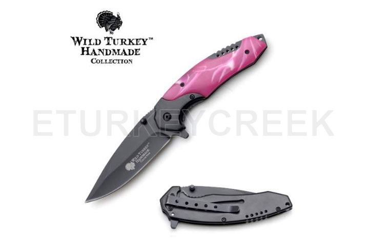 Wild Turkey Handmade Collection Spring Assist Knife .Pink Color Design Handle . Black Blade. 4.5" Closed w/ Pocket Clip