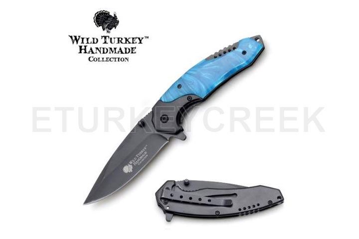 Wild Turkey Handmade Collection Spring Assist Knife .Blue Color Design Handle . Black Blade. 4.5" Closed w/ Pocket Clip