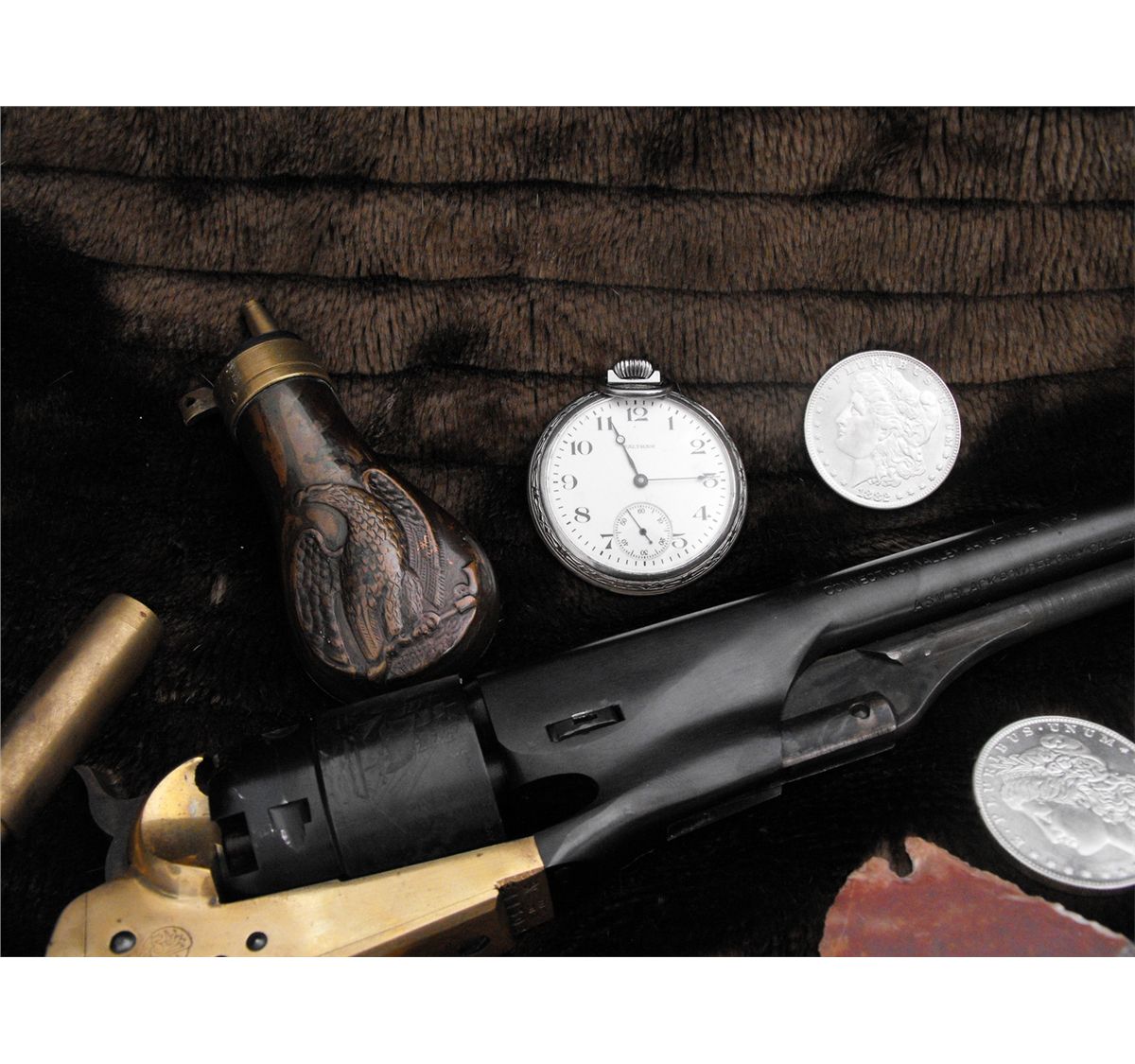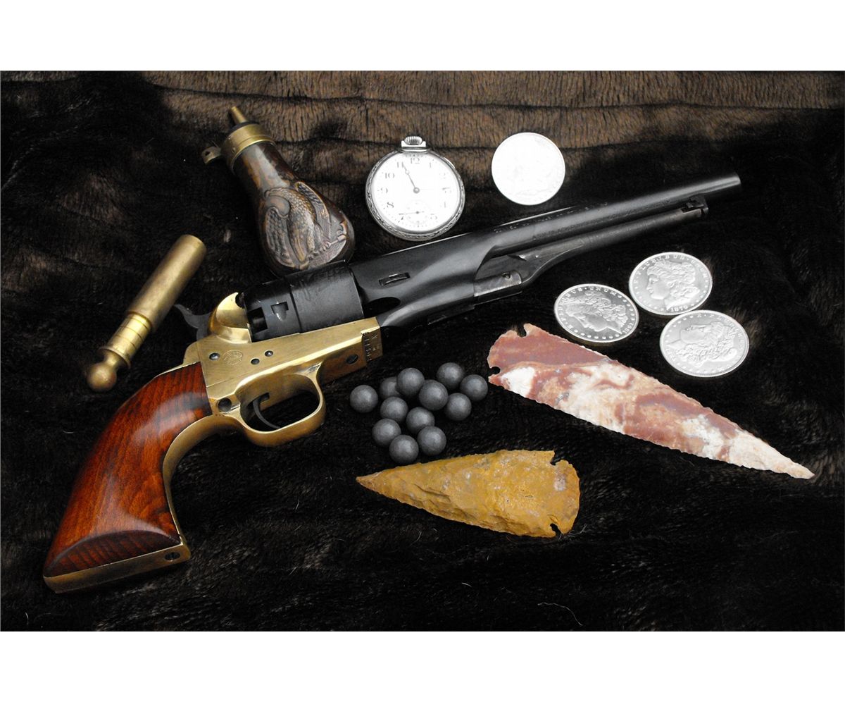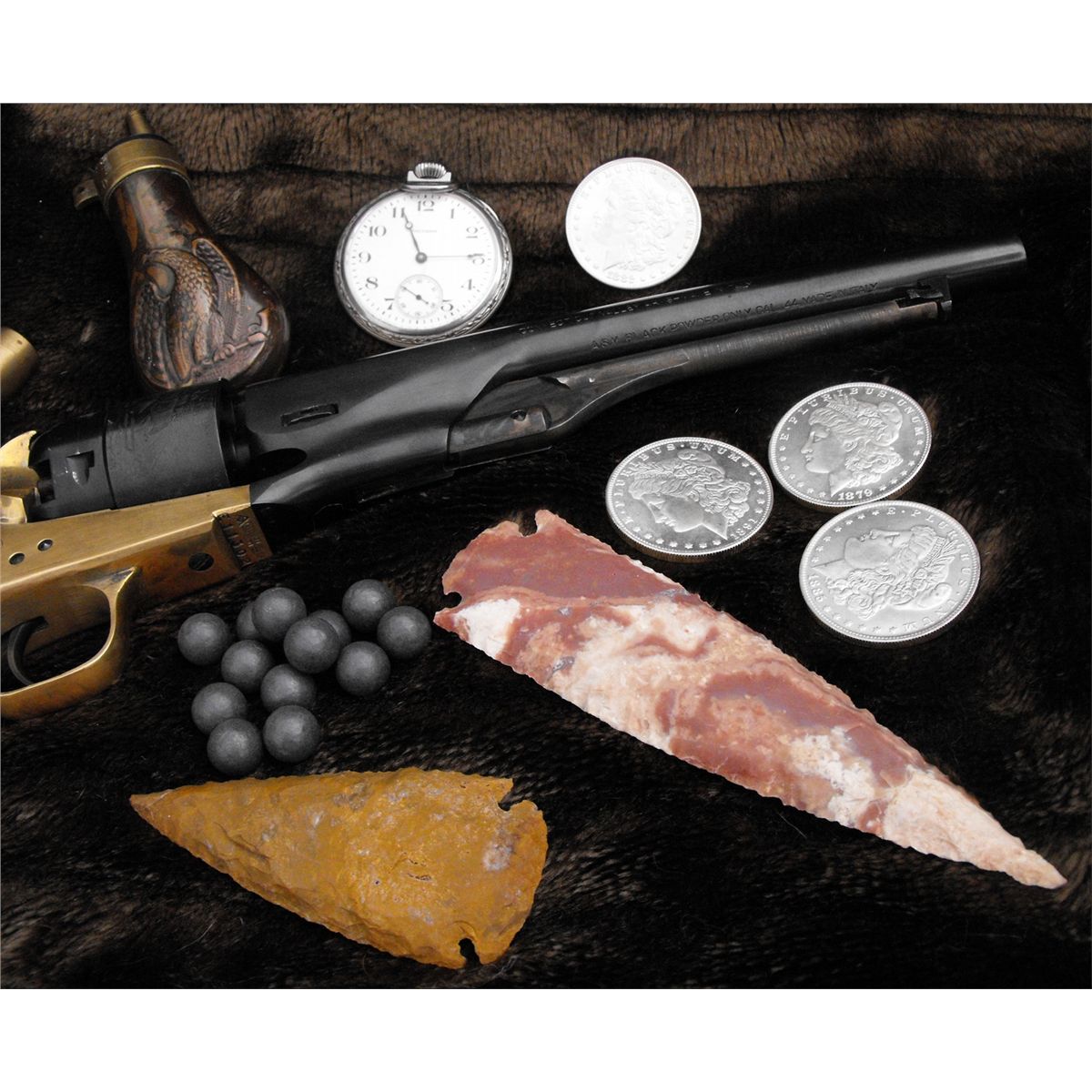 A great lot with a replica REAL FIRING Italian made Black Powder revolver, an ANTIQUE copper and brass powder flask from the 19th century, 2 stone hand chipped spear/arrow tips, a working Waltham Pocket Watch, 4 Carson City Mint Morgan Silver Dollar REPLICA COINS.