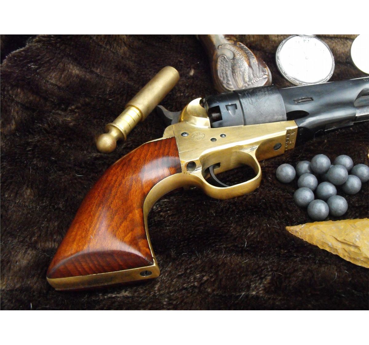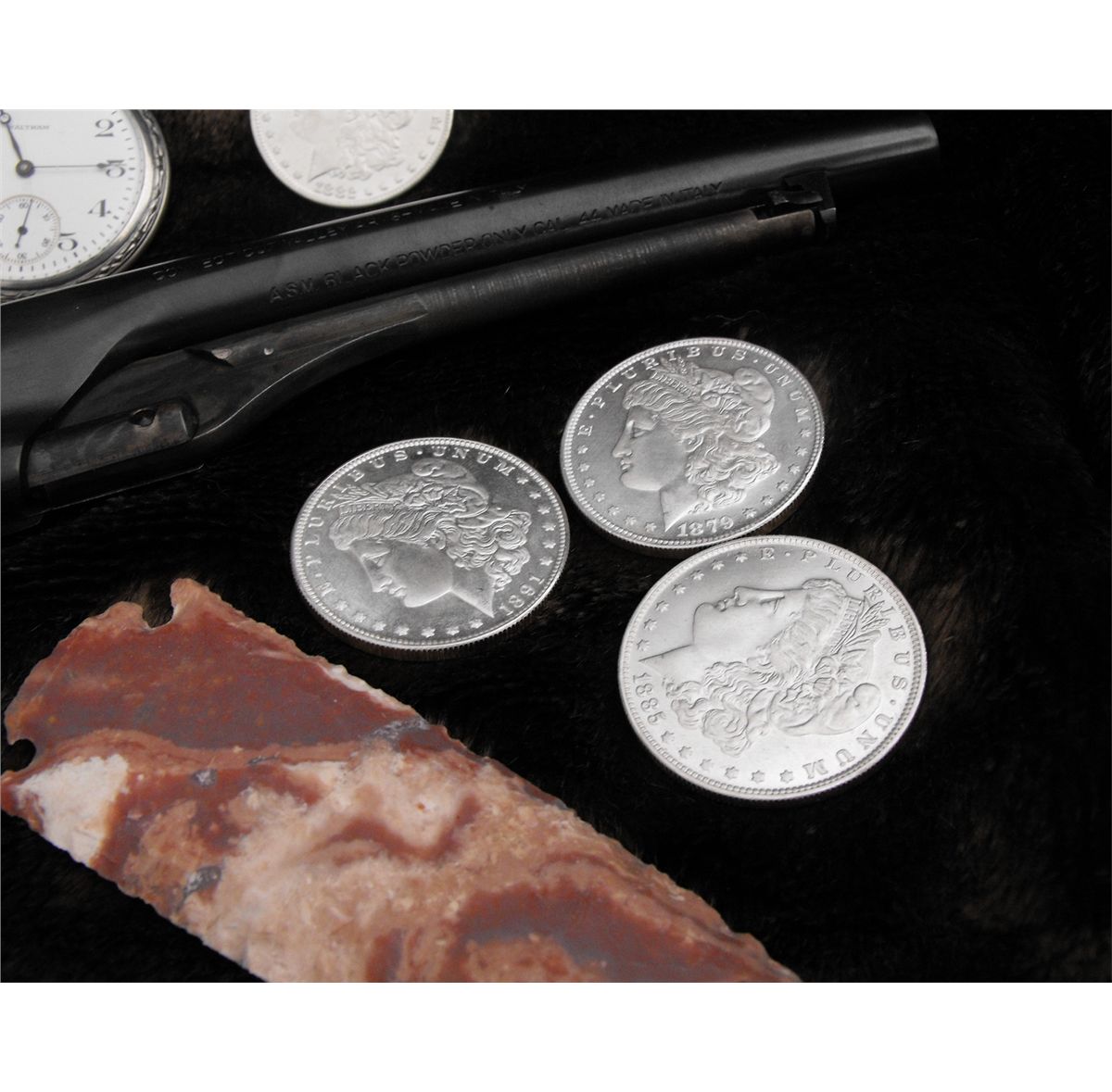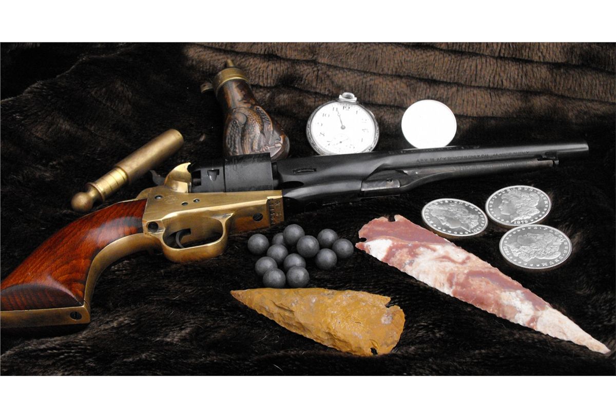 A great lot with a replica REAL FIRING Italian made Black Powder revolver, an ANTIQUE copper and brass powder flask from the 19th century, 2 stone hand chipped spear/arrow tips, a working Waltham Pocket Watch, 4 Carson City Mint Morgan Silver Dollar REPLICA COINS.
