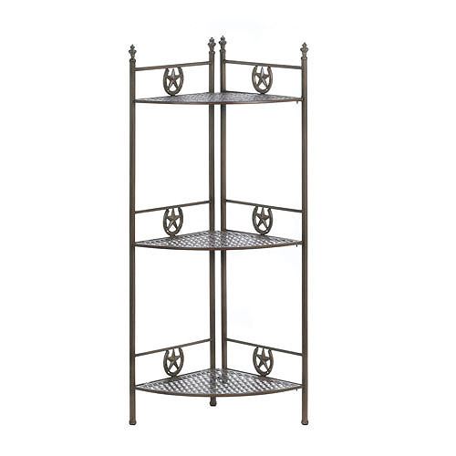 Wild West Corner Rack **|**|** Liven up any corner with this charming Western-style display rack. Three metal shelves fan out from an iron framework thats decorated with lucky horseshoes and stars. Its a great way to showcase your plants or treasured collectibles.Description Details Item weight: 10.8 lbs.Product Dimensions: 19-3/4 x 13-1/2" x 41-1/2" high.Product Material: Cast iron and sheet metal.UPC Code: 849179022709.Packaging: 1 EA"