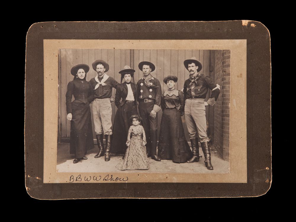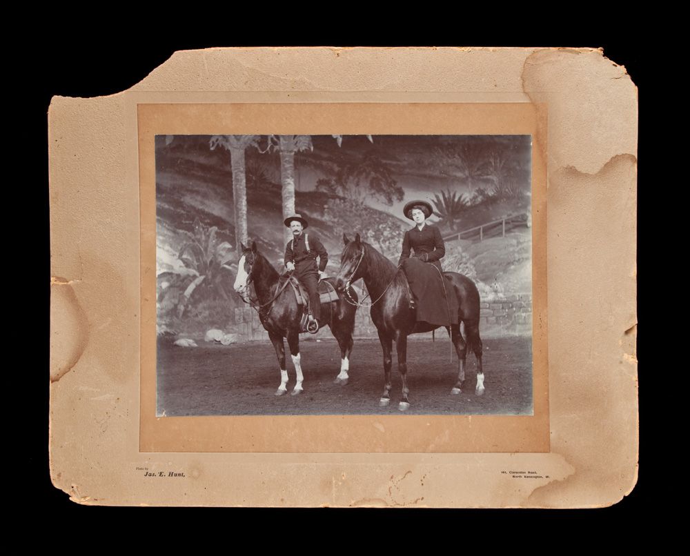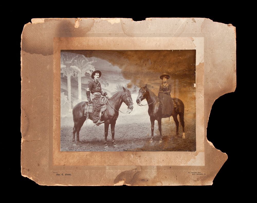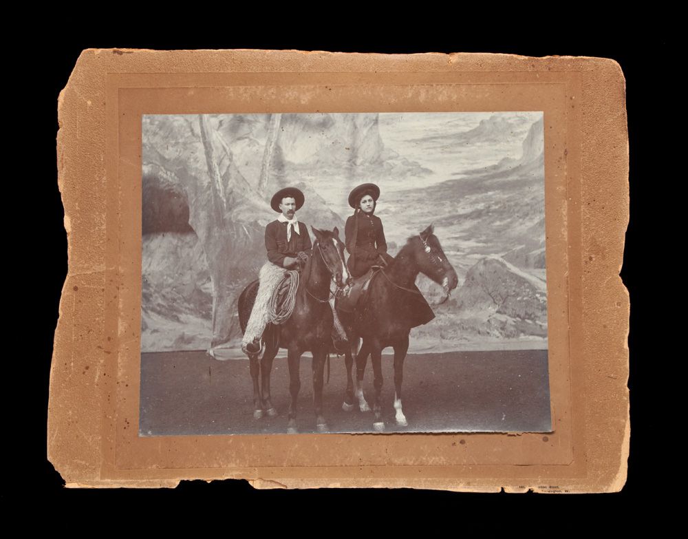 c) Fred Burns and Mable Kirby, dated on back 1903, London. 14” x 18” overall. Burns in cowboy garb with black wooly chaps. Condition bad, heavily stained image on most of right side, clear on left;