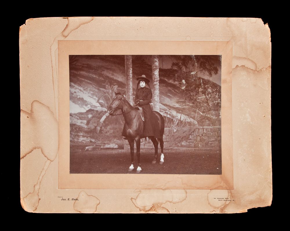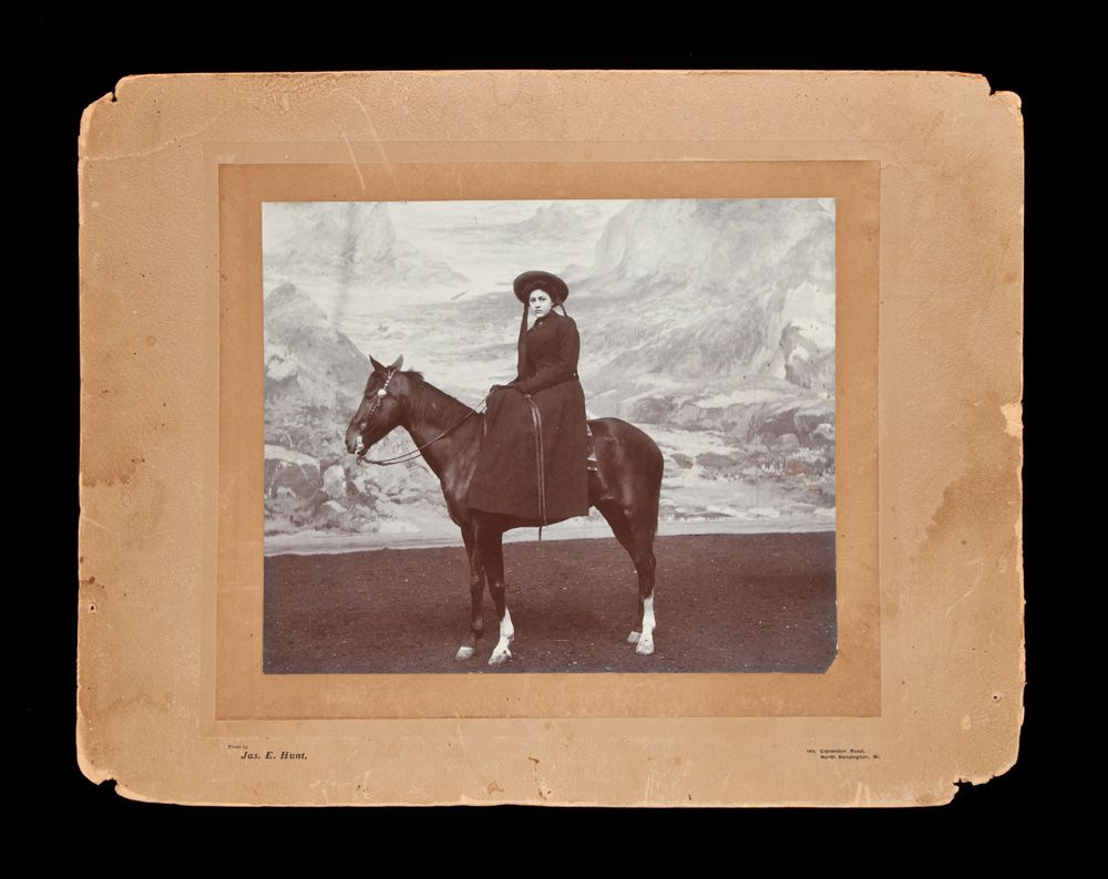 a) Mrs. Mary Phillips, dated on back 1903, London. 14” x 18” overall, it shows her on horseback, with a landscape backdrop. Image in very good condition;
