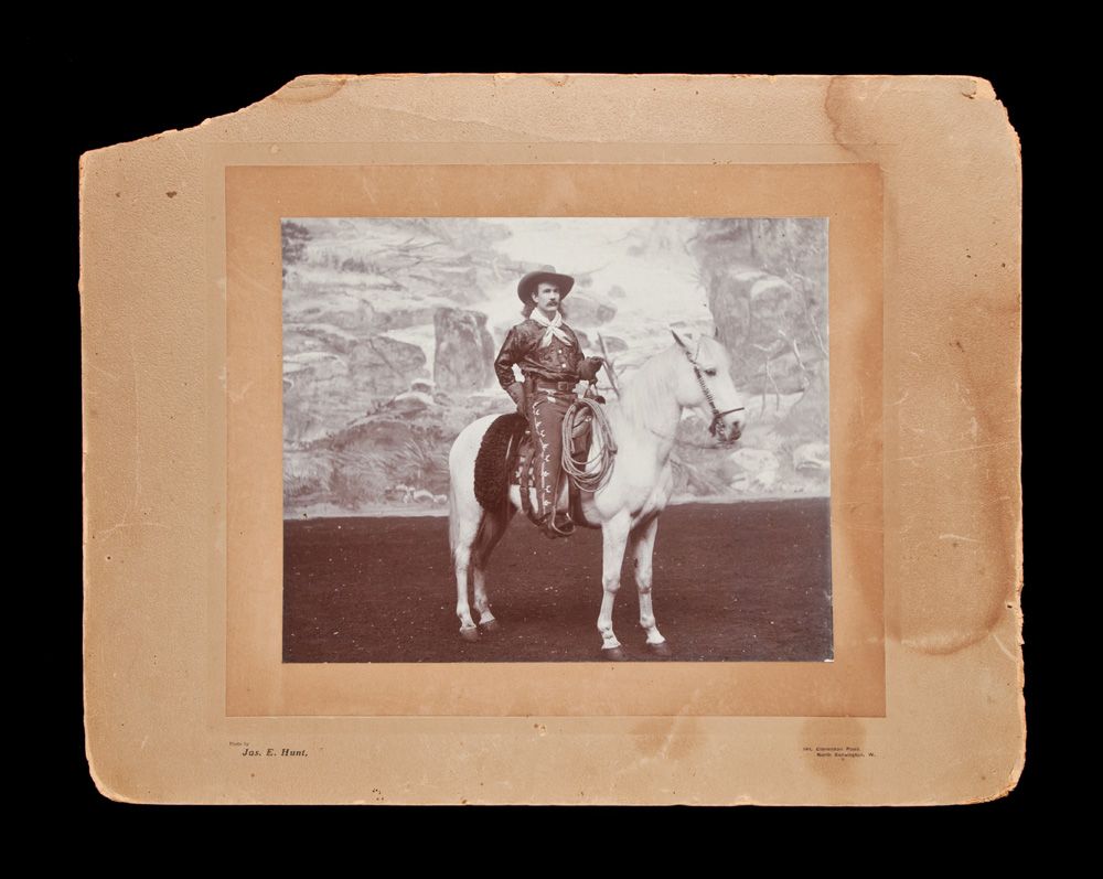 d) Bill McCloud, dated on the back 1903, London. Size 14” x 18” overall. McCloud on white horse, cowboy garb and hat. Image excellent;