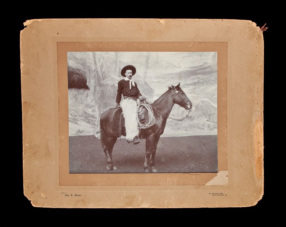 b) Ed H. Phillips, dated on back 1903, London. 14” x 18” overall. Ed dressed in cowboy garb, white wooly chaps, rope, hat and neckerchief. Image in very good condition;