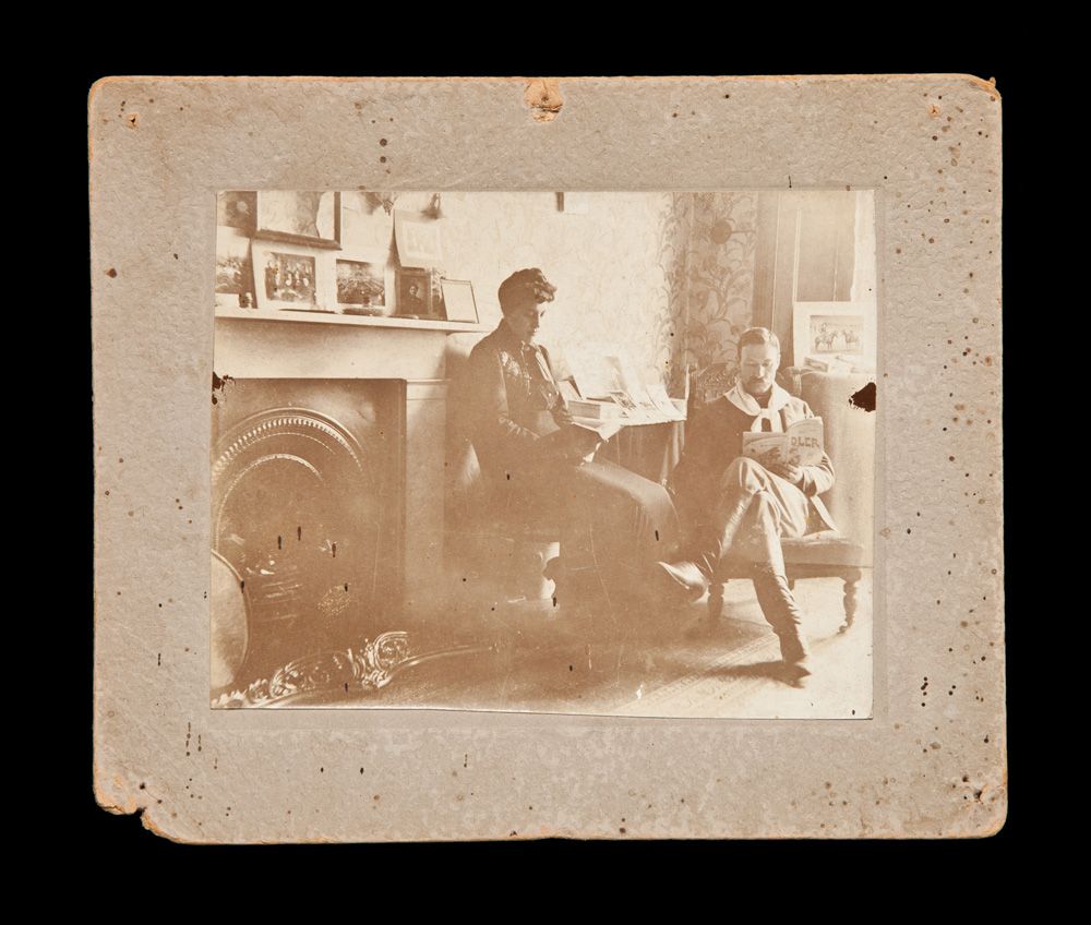 h) 5” x 6” mounted image showing Ed Phillips and his wife Mary by the fireplace; In the background to the right is one of the mammoth photos listed above, showing Fred Burns and Mable Kirby on horseback. On the left behind Ed Phillips is another mammoth photo of cowboy Bill McCloud;