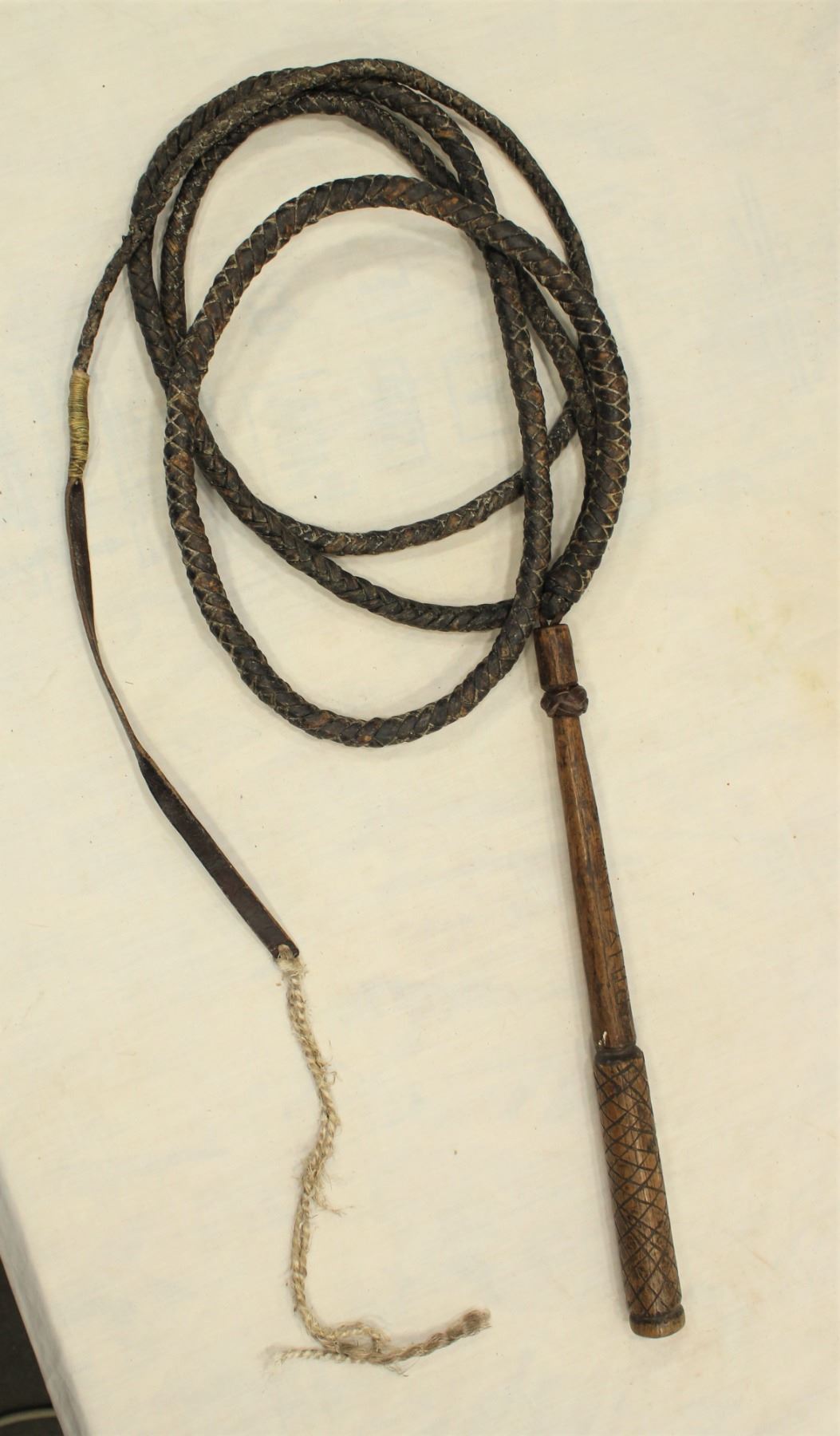 Terrific 11 foot long 4 plait Wild West whip with 15" decoratively carved wooden handle.