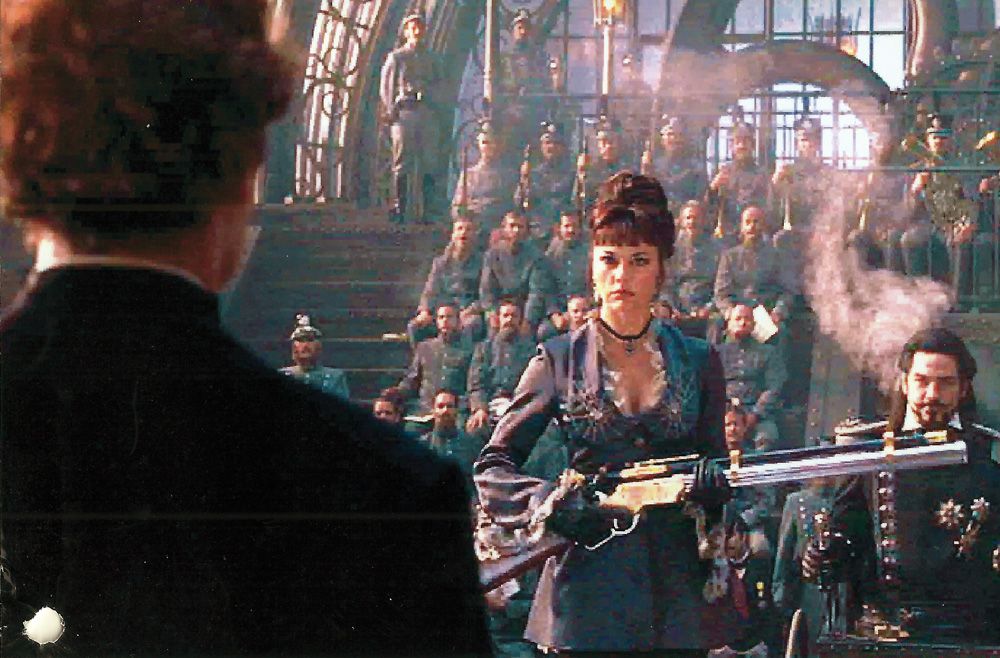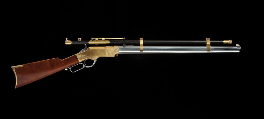 A movie-used Uberti, E.M.F. Henry Rifle prop from the 1999 film, “Wild Wild West” starring Will Smith, Kevin Kline and Salma Hayek. Used by the weapons expert Munitia played by Musetta Vander. Clearly seen in the movie, this brass and nickel rifle with long telescopic (prop) optics stands out as period and correct. .45 long Colt caliber, 24” bbl. Serial #16429. From the 2007 sale of “The World Famous Stembridge Armory Collection”.