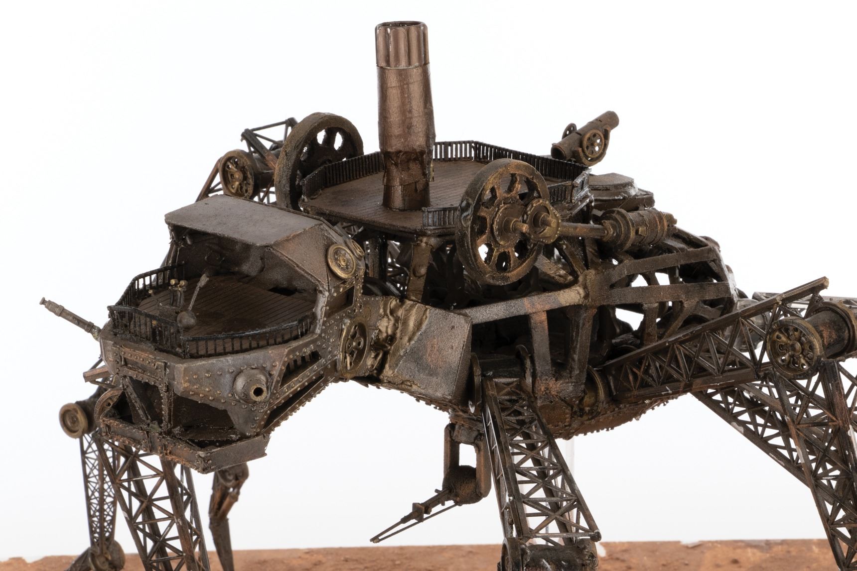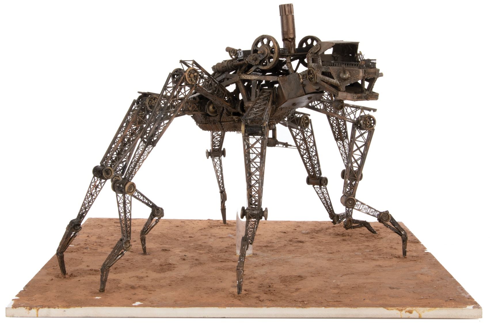 496. Wild Wild West "Spider Tank" model miniature maquette. (Warner Bros., 1999) Original incredibly intricate and detailed Spider Tank maquette constructed of cast resin, metal and multimedia components expertly assembled and finished hyper-realistically by the industry's finest model makers. An incredible example of the steampunk style and the Sonnenfeld team's visionary take on the Wild Wild West franchise. The model measures approx. 25.5 x 20 x 15 in. Affixed to a central lucite post attached to a 23 x 23 x .05 in. wooden base expertly surfaced with fuller's earth and modeling materials to appear as desert floor. Exhibiting minor age and wear. In very good to fine condition. From the collection of Barry Sonnenfeld. $4,000 - $6,000