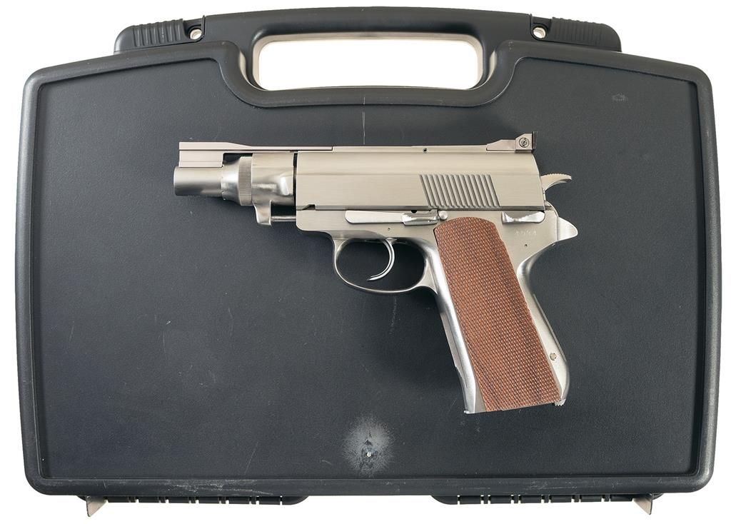 Fixed blade changeable front sight, fully adjustable rear sight, serrated front strap, selective single or auto loading capability. Case comes with manual and factory test tag.