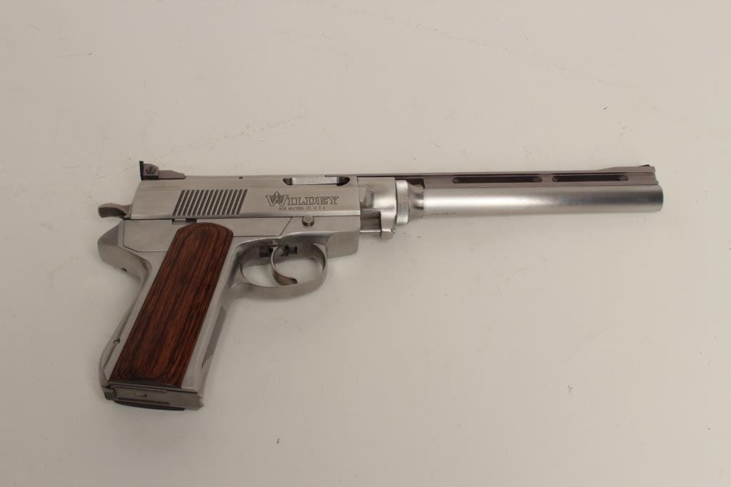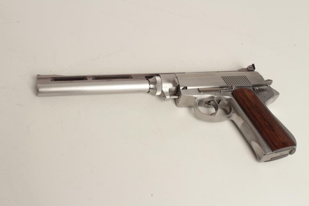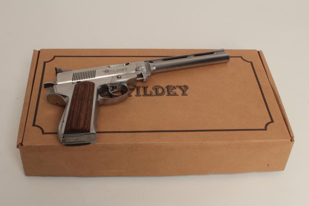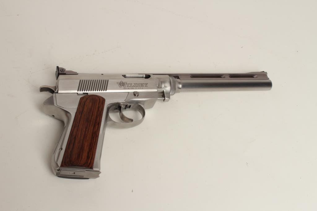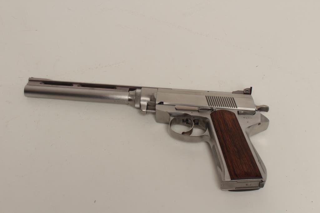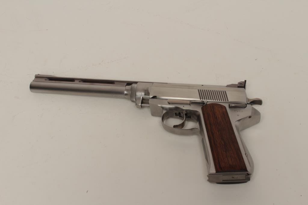 Mag. caliber, 7” barrel, stainless steel, wood grips, S/N 4500, in like new condition with one extra magazine and in factory cardboard box. (Modern/PPT). Est.: $1,400-$2,800.