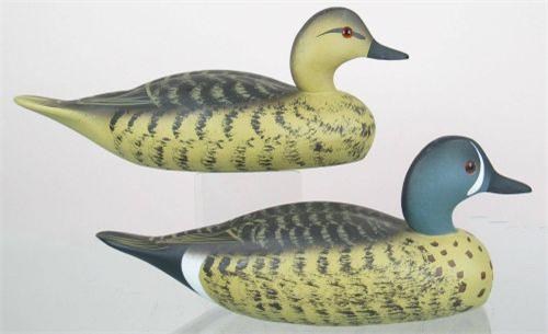 Wildfowler Factory pair of blue-winged teal decoys in near mint condition. Unused, no brand. Possibly from the Point Pleasant, NJ location . H. Provenance: Pitt Collection.
