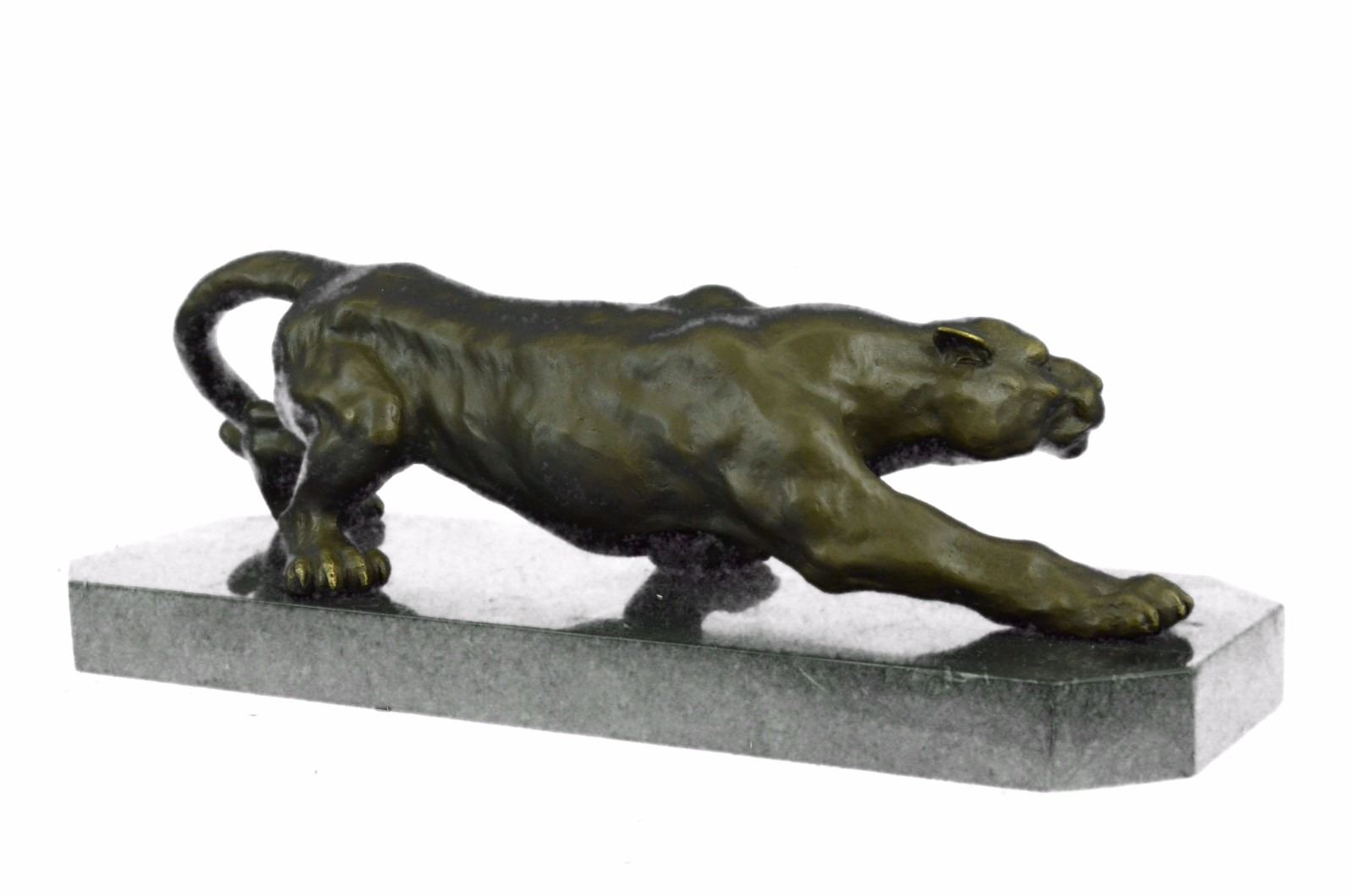 A Lioness Wanders Through Her Wild African Habitat After Chasing Away A Predator From Her Cubs. She Is Fierce Yet Nurturing, Ready To Fight To The Death To Protect Herself Or Her Young. The Deep Carving Of This Sculpture Are A Tribute To The Rugged Strength Lions Possess. She Appears Somber Here, Adopting A Slow Pace And Representing A Duality Of Strength And Calmness. This Piece Was Cast Using The Lost Wax Method And Is A Reproduction Of French Artist Bugatti. Bronze Dimensions With Marble Base: Height 6 X Width 16 inches. Weight: 19 Lbs.Please Note: This is a reproduction bronze sculpture from the original molded and signed. This featured bronze sculpture is a recast after the original, and has been done recently. This 100% bronze sculpture is an abstract piece certain to be a conversation piece.Please Note: This is a reproduction bronze sculpture from the original molded and signed. This featured bronze sculpture is a recast after the original, and has been done recently. This 100% bronze sculpture is an abstract piece certain to be a conversation piece.