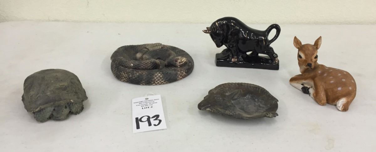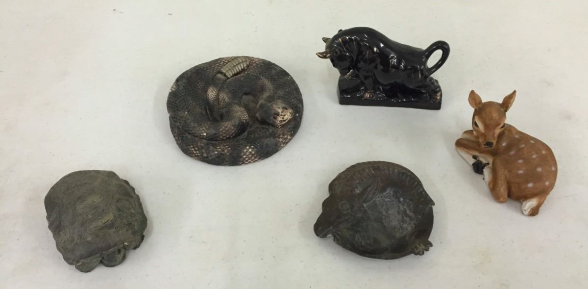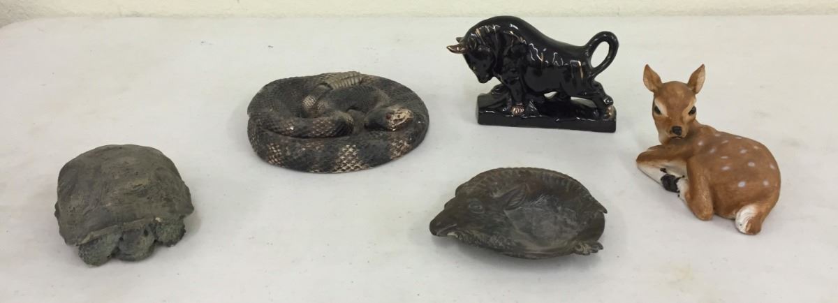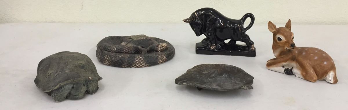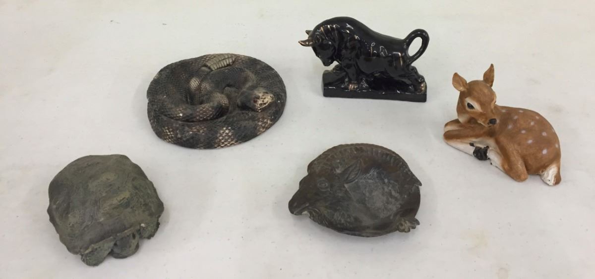 The bighorn sheep ashtray is metal. The bull, snake deer and turtle are all ceramic pours. Please look closely at pics - they are an important part of our description. Shipping: There will be a $8 handling / packaging fee for shipping this lot. The actual cost of postage will be added on top of that.