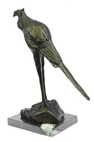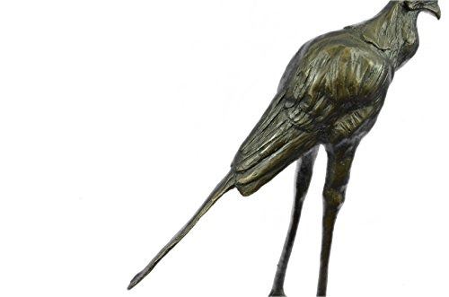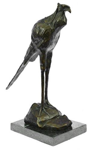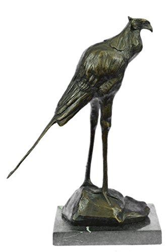 This Bronze Sculpture Is Of A Secretary Bird, Standing Tall With Crane Like Legs And Long Wings, This Bird Is Breathtaking. The Sculpture Was Made Using The Lost Was Method. A Simply Gorgeous Piece With Class, Bring Some Class In To Your Today. Below You Will Find Information About The Secretary Bird And The Artist. The Secretary Bird Or Secretary Bird Sagittarius Serpentarius Is A Large, Mostly Terrestrial Bird Of Prey. Endemic To Africa, It Is Usually Found In The Open Grasslands And Savannah Of The Sub-Sahara. Although A Member Of The Order Accipitriformes, Which Also Includes Many Other Diurnal Raptors Such As Kites, Buzzards, Vultures, And Harriers, It Is Given Its Own Family, Sagittariidae. Its Common Name Is Popularly Thought To Derive From The Crest Of Long Quill-Like Feathers, Lending The Bird The Appearance Of A Secretary With Quill Pens Tucked Behind His Or Her Ear, As Was Once Common Practice. A More Recent Hypothesis Is That Secretary Is Borrowed From A French Corruption Of The Arabic Saqr-Et-Tair Or Hunter-Bird. Bronze dimensions with marble base: Height 11 X Width 11 inches. Weight: 7 lbs.Please Note: This is a reproduction bronze sculpture from the original molded and signed. This featured bronze sculpture is a recast after the original, and has been done recently. This 100% bronze sculpture is an abstract piece certain to be a conversation piece.Please Note: This is a reproduction bronze sculpture from the original molded and signed. This featured bronze sculpture is a recast after the original, and has been done recently. This 100% bronze sculpture is an abstract piece certain to be a conversation piece.
